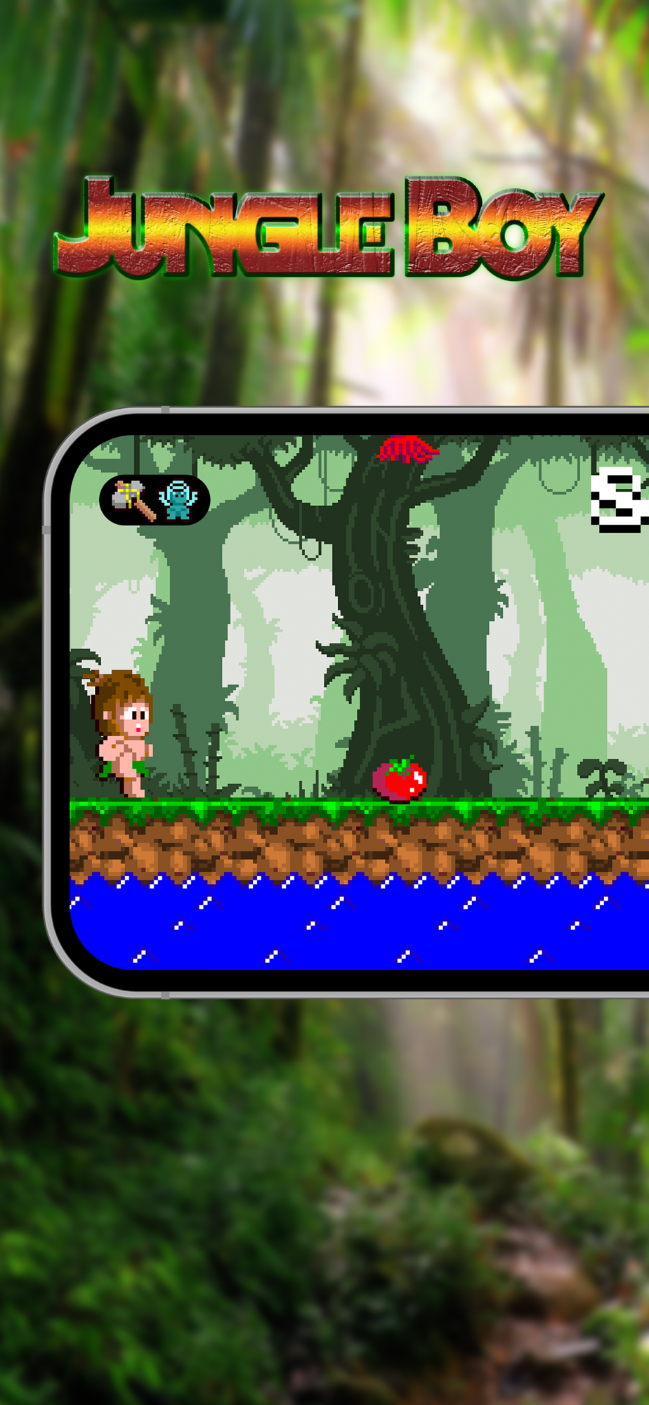 Jungle Boy is a side-scrolling game featuring 2D retro style graphics. The objective is to walk or run to the right, avoiding nasties and rocks. If you touch any nasties you lose a life, collect as many food as you can.