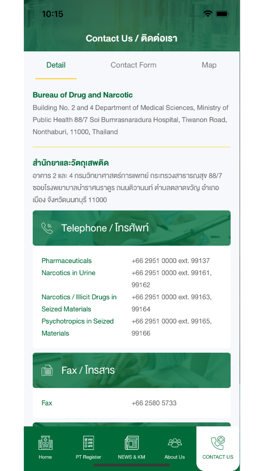 BDN : Proficiency Testing, Bureau of Drug and Narcotic แอปพลิเคชันให้ความรู้ แจ้งข่าวสาร ประชาสัมพันธ์กิจกรรมทดสอบความชำนาญ (Proficiency Testing) และเป็นระบบจัดการแจ้งเตือนกำหนดการ สำหรับผู้เป็นสมาชิกที่สมัครเข้าร่วมการทดสอบ โดยมีขอบข่ายการทดสอบสำหรับห้องปฏิบัติการด้านยา ด้านสารเสพติดในปัสสาวะและด้านยาเสพติดในของกลาง จัดโดยสำนักยาและวัตถุเสพติด กรมวิทยาศาสตร์การแพทย์