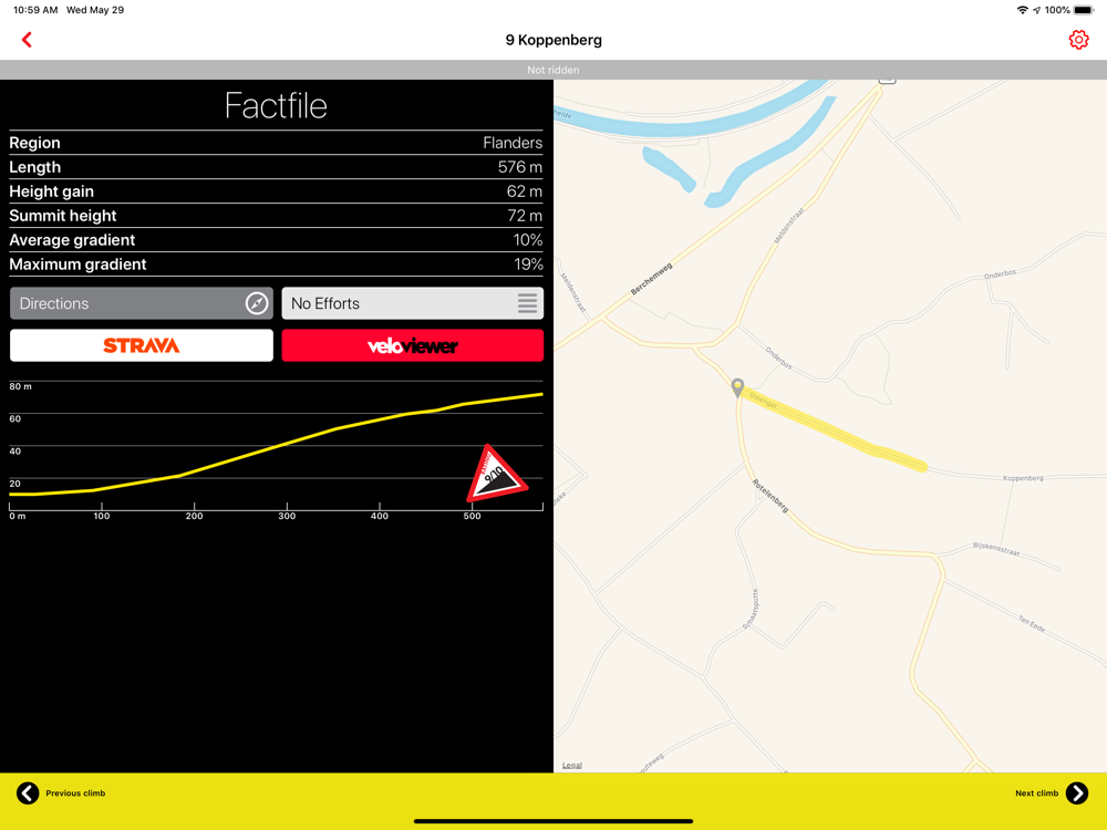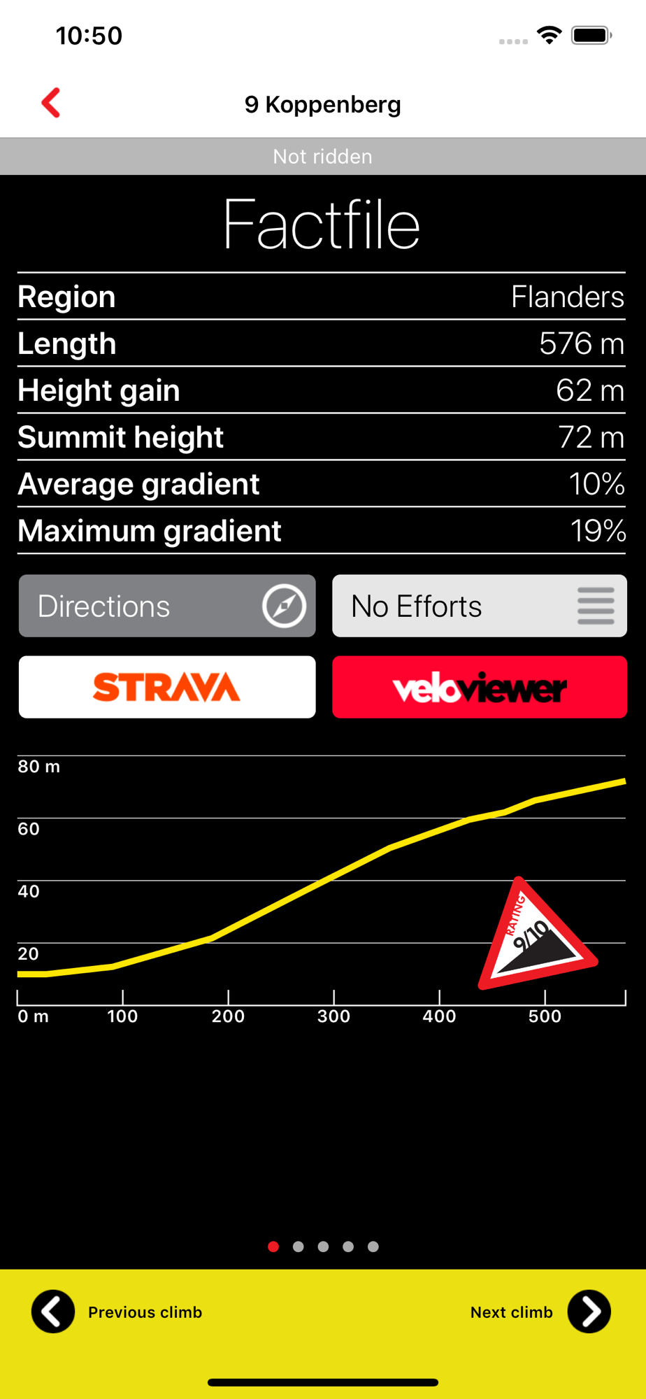 Exploring further you will see that via the interactive map you can locate and be instantly directed to the base of each climb and be taken to it’s factfile. In the factfile you will see the climb’s vital statistics together with comprehensive directions, a profile, a link to your previous efforts and the ability to view it on Strava. Alternatively you can scroll the list which can be sorted by difficulty, geographically, by ridden, or best of all, by which is nearest to your current location. So if you find yourself in Belgium, if you have your bike and you can spare the time you can head straight to the nearest climb on the list and bag it.