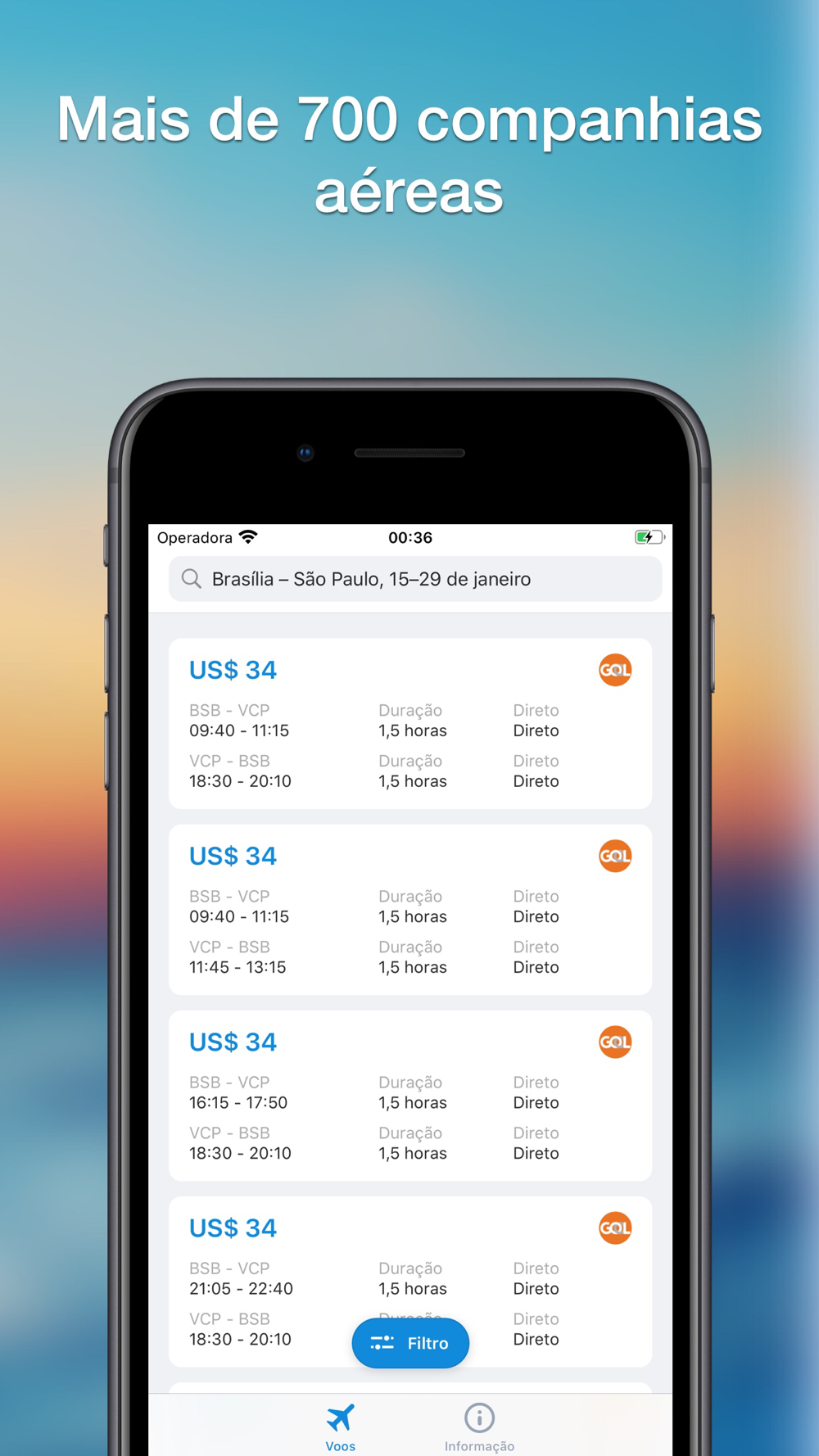 • Encontre ofertas de todas as linhas aéreas brasileiras, inclusive Azul, Avianca, Gol, TAM, Passaredo;
