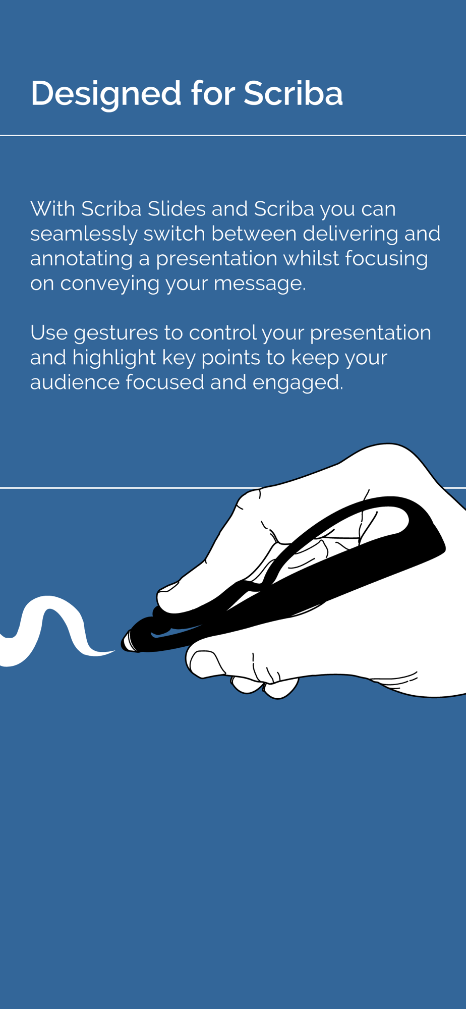 Scriba Slides is an intuitive app for delivering more interactive slide presentations. Paired with the Scriba stylus, users can seamlessly switch between delivering and annotating a presentation whilst focusing on delivering their message.