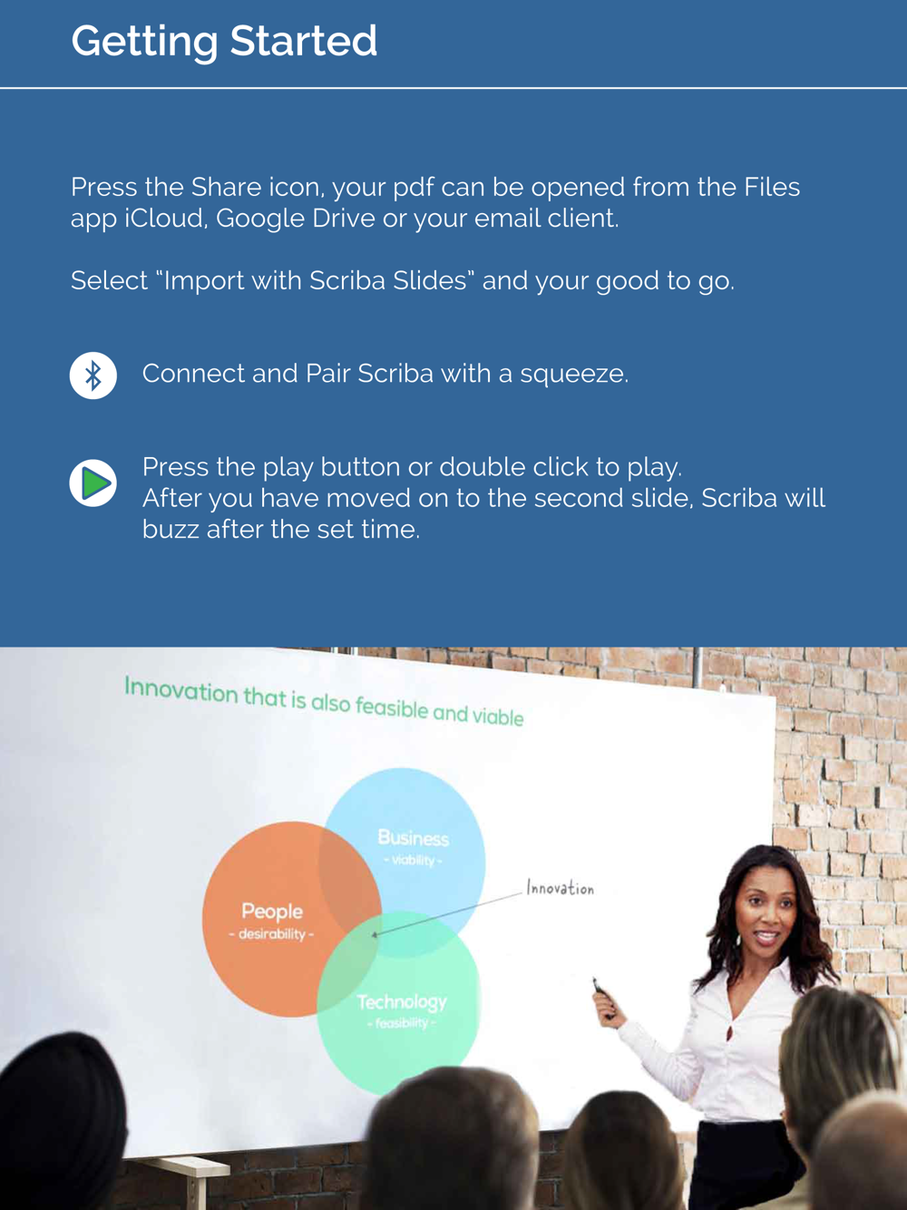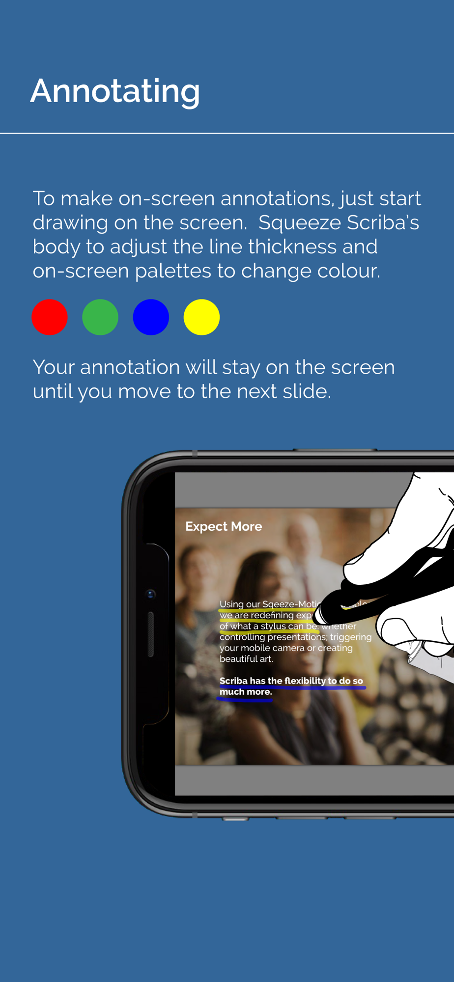 Scriba is much more than just a stylus - it’s a digital multi-tool that provides a diverse range of functionality to the mobile worker. Connected to a mobile device, our unique “Squeeze Motion” technology elevates presentations and storytelling skills to the next level.