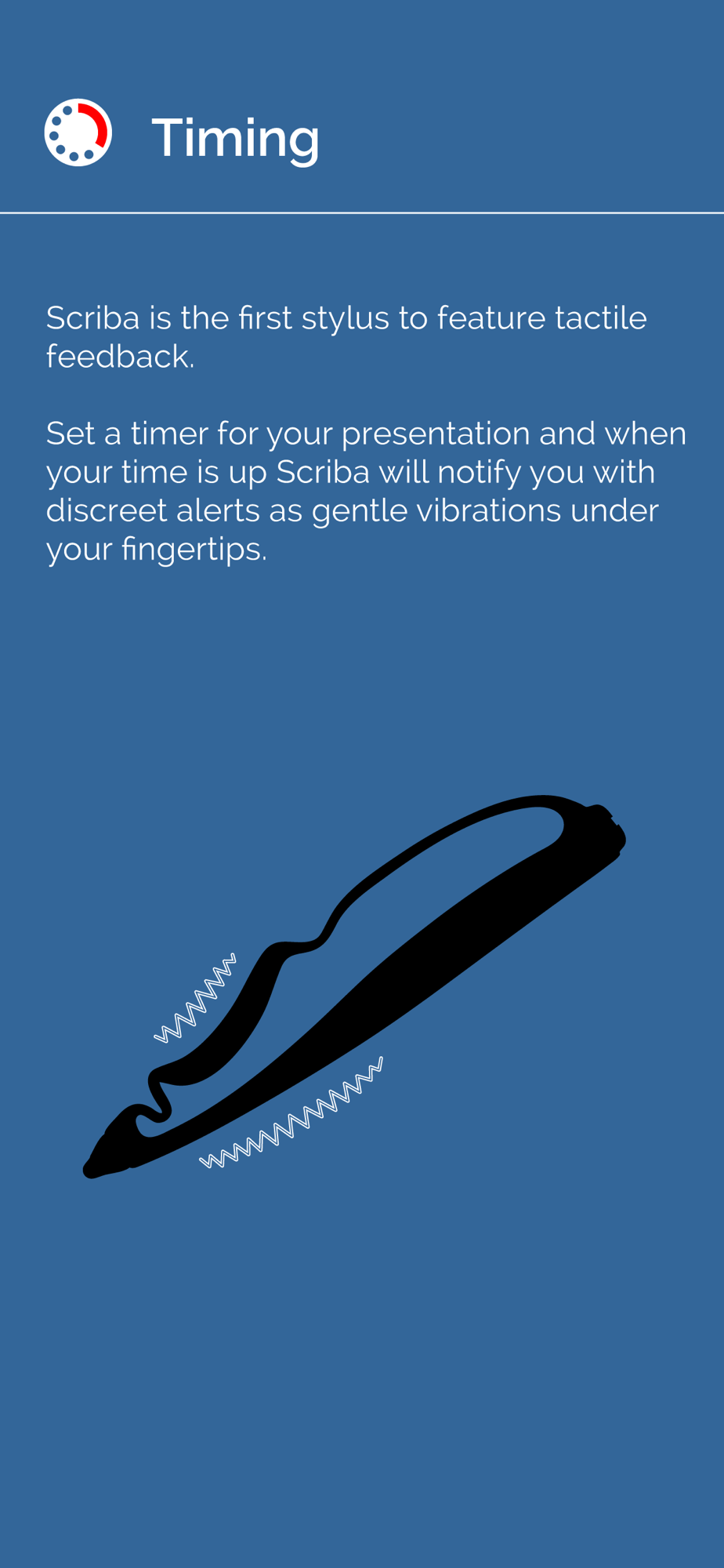 Scriba Slides also helps prevent the user’s presentation from accidentally running over time. Scriba is the first stylus (or presentation remote) to feature haptic feedback providing the user with real-time feedback on the timing of their presentation through patterns of discreet vibrations under their fingertips.