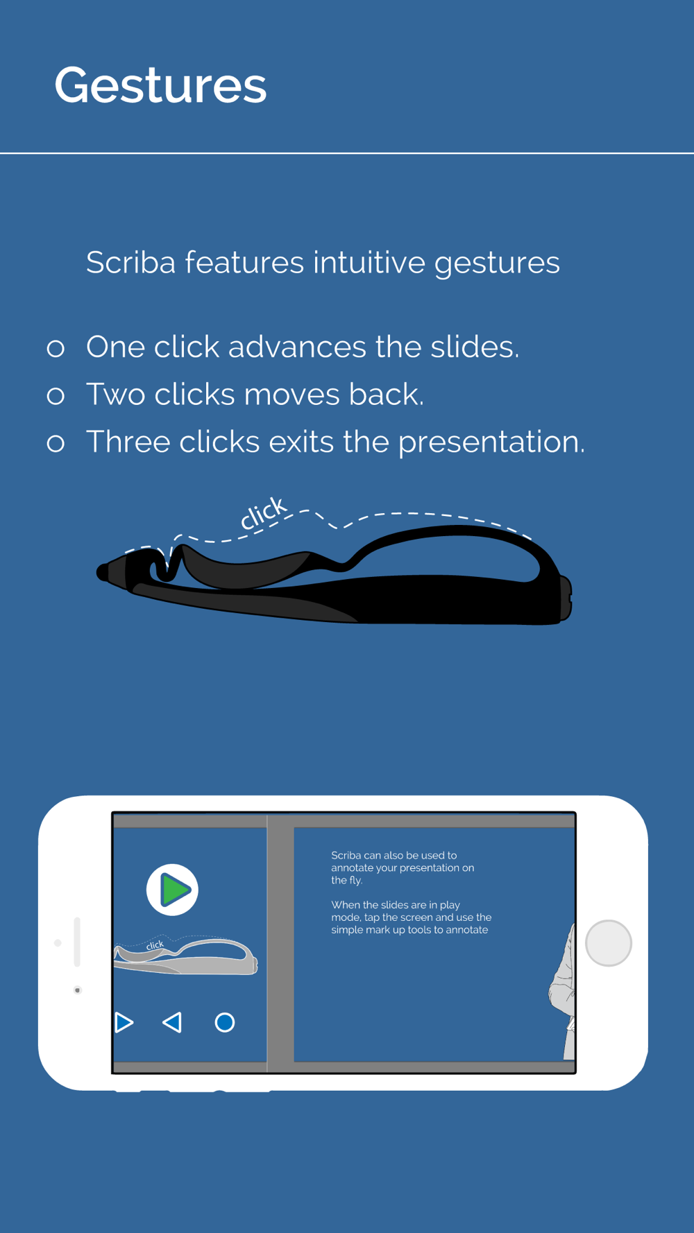 Sitting comfortably in the user’s hand, Scriba acts as both a responsive presentation remote and a pressure sensitive stylus. Slides can easily be advanced or rewound with a simple squeeze action and as Scriba is primarily a stylus, slides can be quickly annotated mid-presentation. This unique combination of functionalities make the combination of app and accessory a must have for the anyone that regularly delivers presentations.