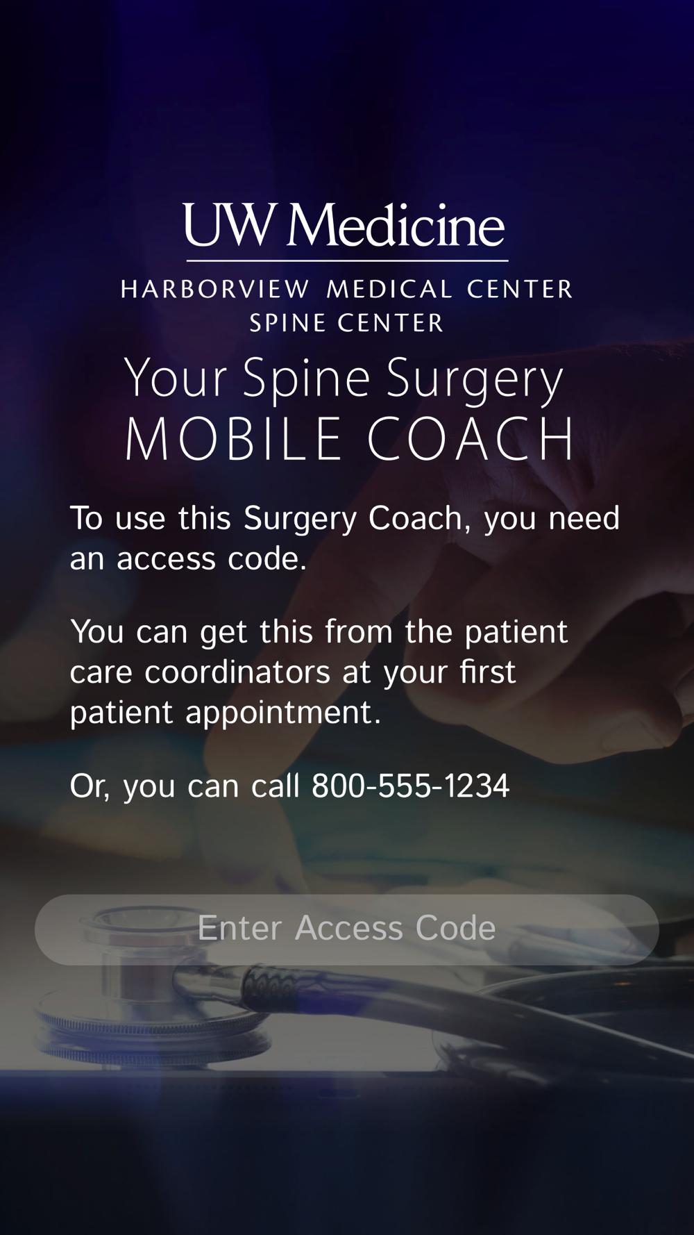 The University of Washington Spine Surgery Mobile Coach helps patients prepare for spine surgery and to recover faster from this surgery. This is a Mobile App specifically designed for the University of Washington, Harborview Medical Center, Spine Clinic.