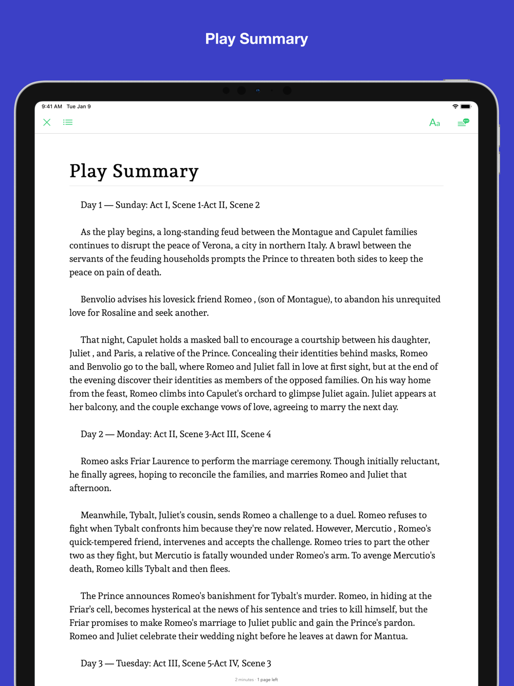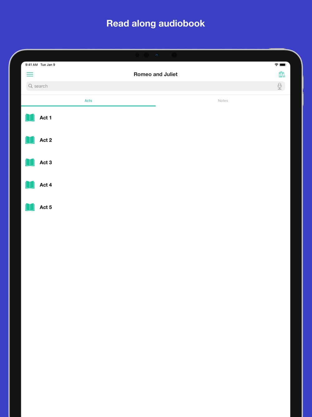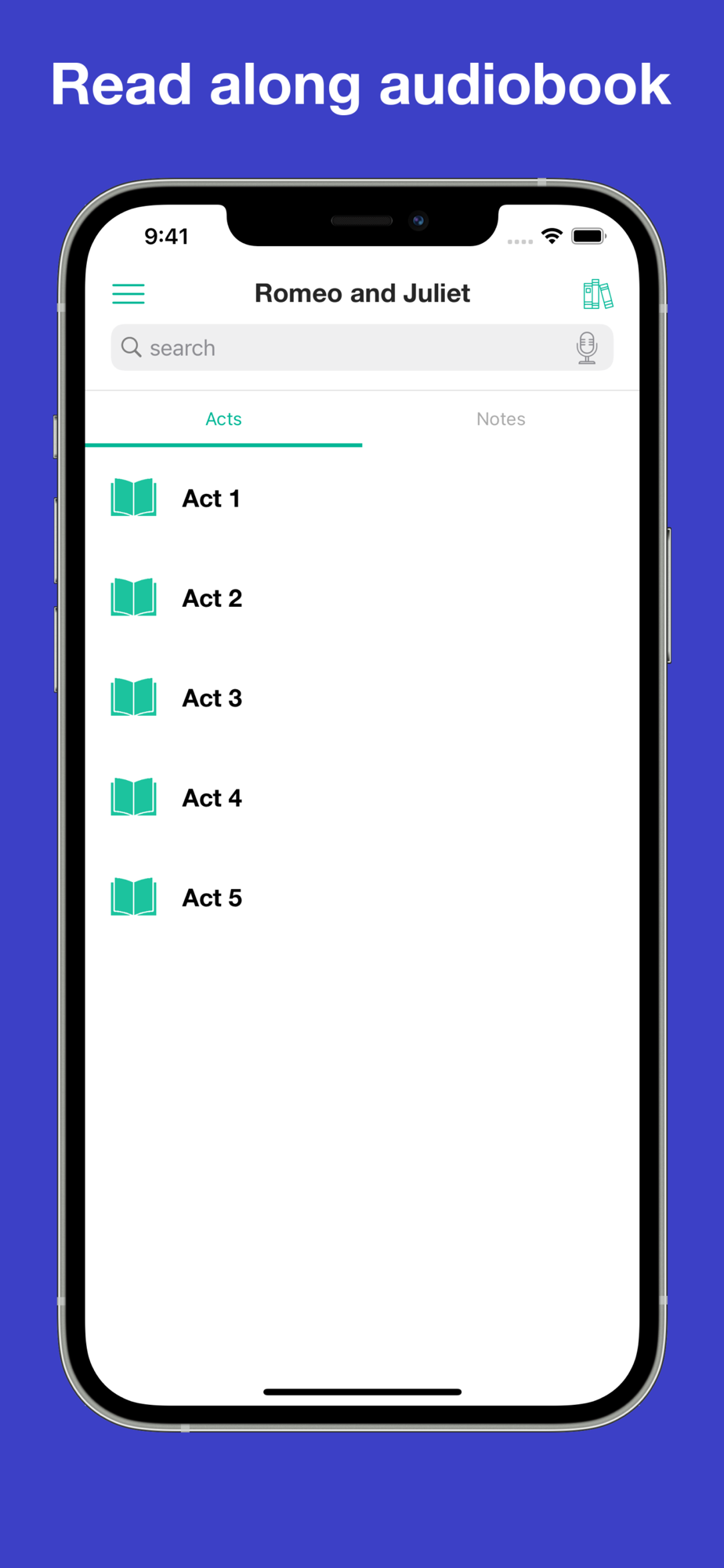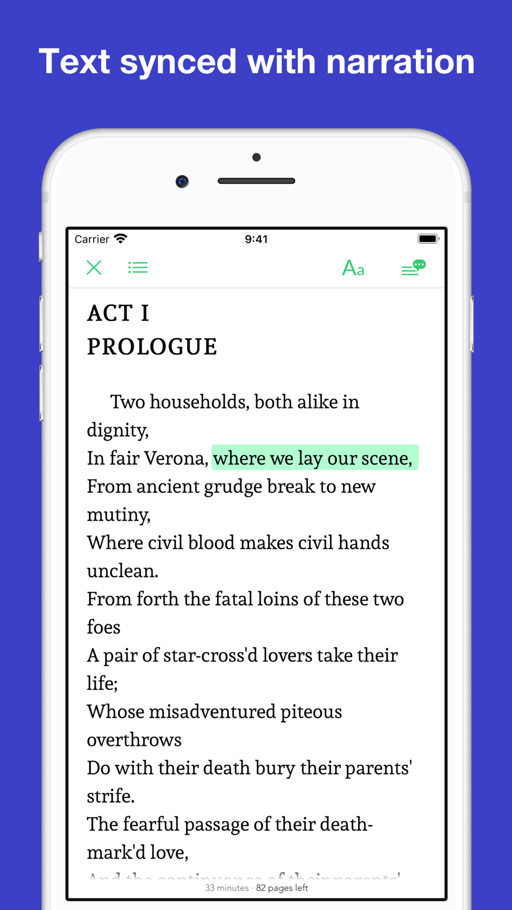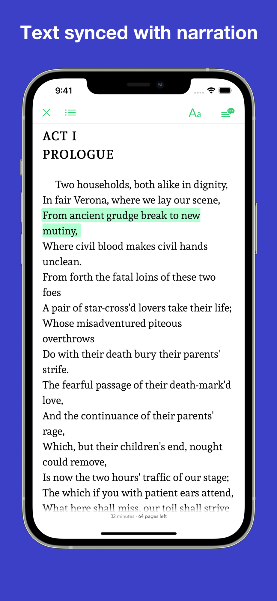 This app combines the play "Romeo and Juliet" by Shakespeare with professional narration enabling read along feature, a professional narration synchronized with the highlighted text. Benefits of Read along feature: a valuable tool for people affected by reading disorders and dyslexia a useful tool for kids to learn reading or for people to learn a foreign language allowing everybody to enjoy their favorite novels by reading, listening or reading and listening at the same time Long press a word and tap "Play" to activate sync transcript Study materials: Context Play Summary List of Characters Summary and Analysis Glossary Character Analysis Author's biography Essays Quotes: Famous quotes from Romeo and Juliet Bookmark a quote Share a quote Basic features: Change font, font size Day and Night reading mode Highlight texts Read aloud