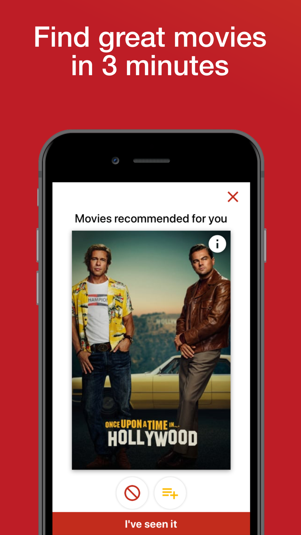 Thanks to its intuitive design, you will easily navigate through a database of 30,000+ movies. Move from one to another in just one swipe. To the right : I liked ! To the left : I didn’t ! The more you swipe, the better the recommendations get. Our algorithm improves with every swipe to propose you movies matching your tastes. Build your own watchlist and finally spend more time watching a movie than looking for it.