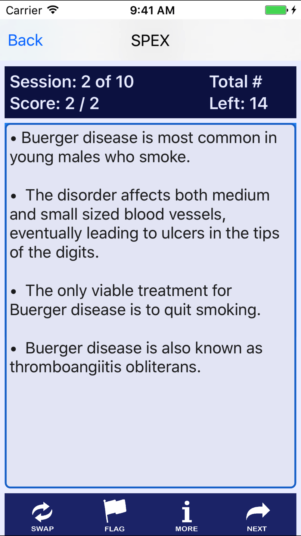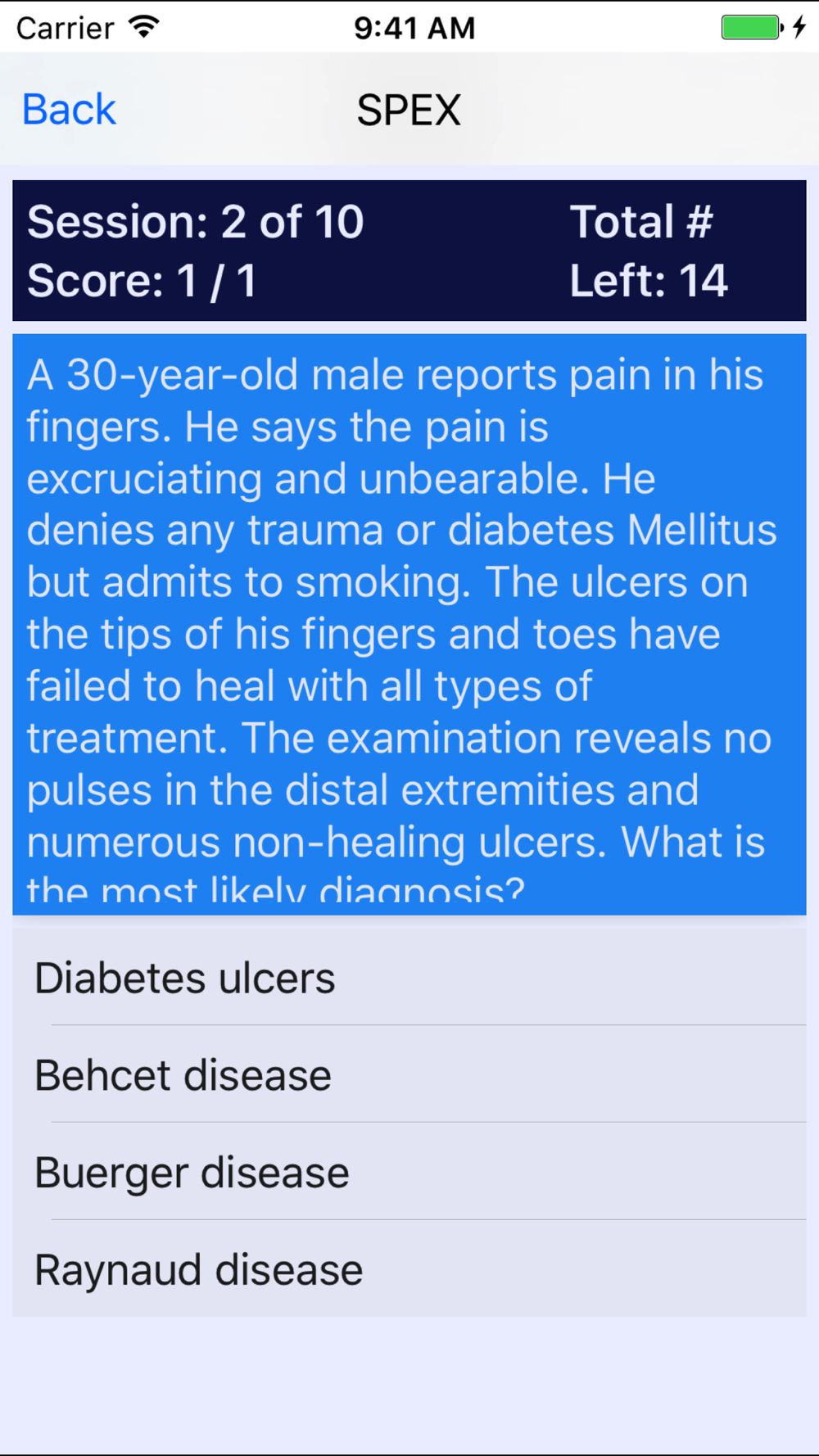 The app offers 10 or more free multiple-choice questions with explanations for 3 different SPEX Board review topics. Each specialty offers additional questions which are available as an in app purchase. The following specialties are available: