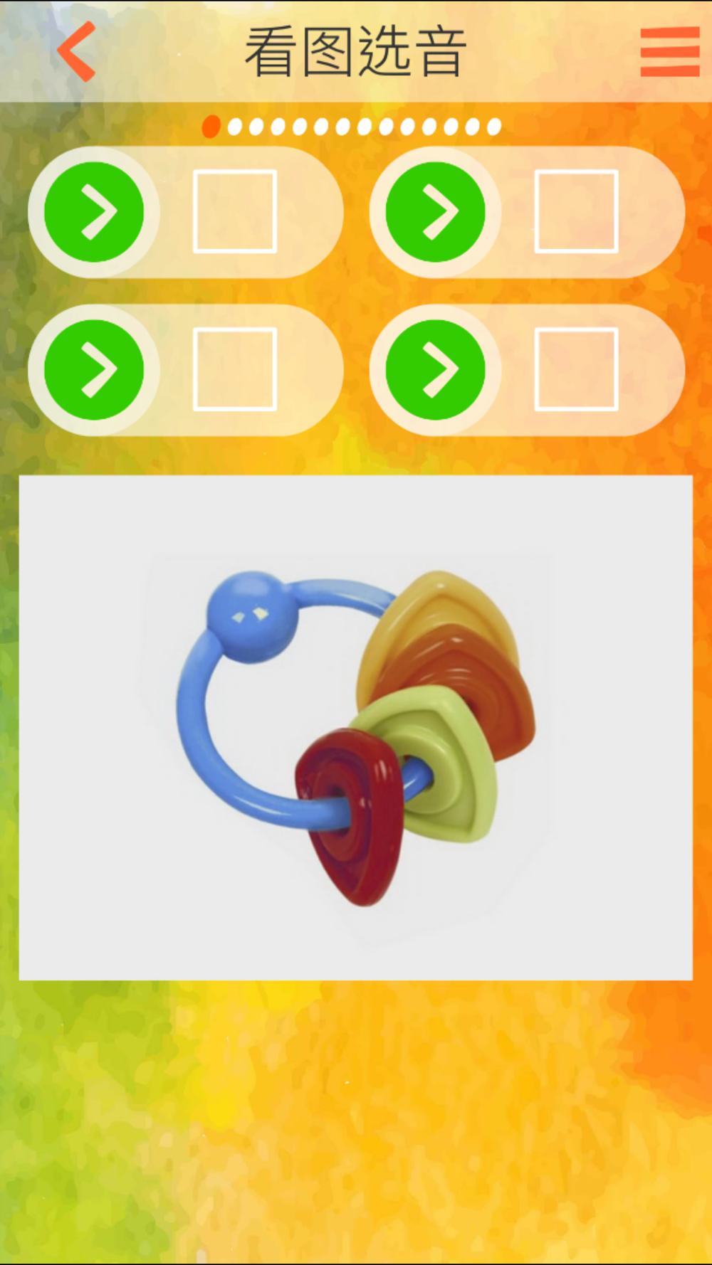2,当对单词有一定的认识后进入练习模式。练习模式由:听声选图、看图选声、模拟录音、看字选图等组成。