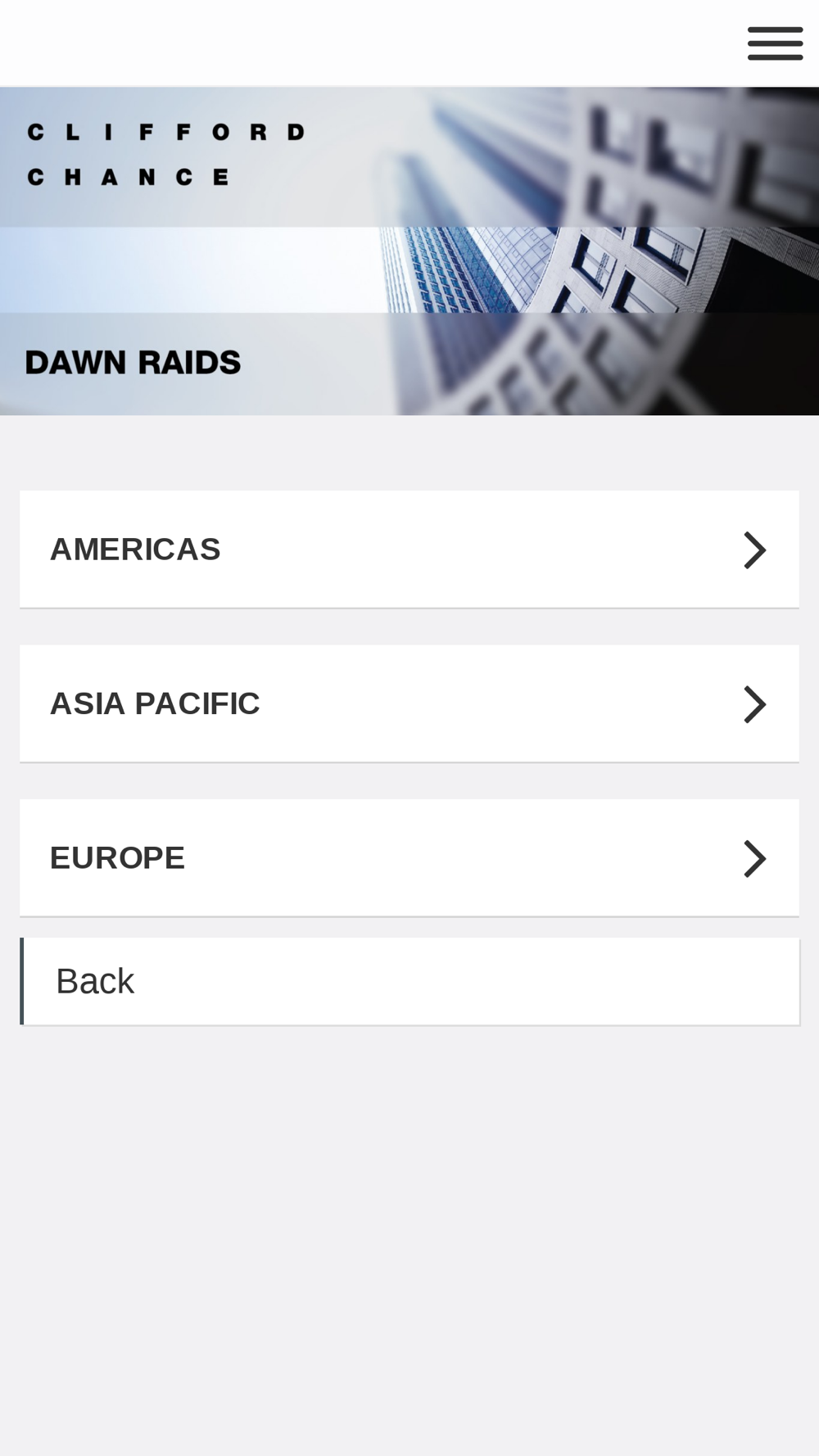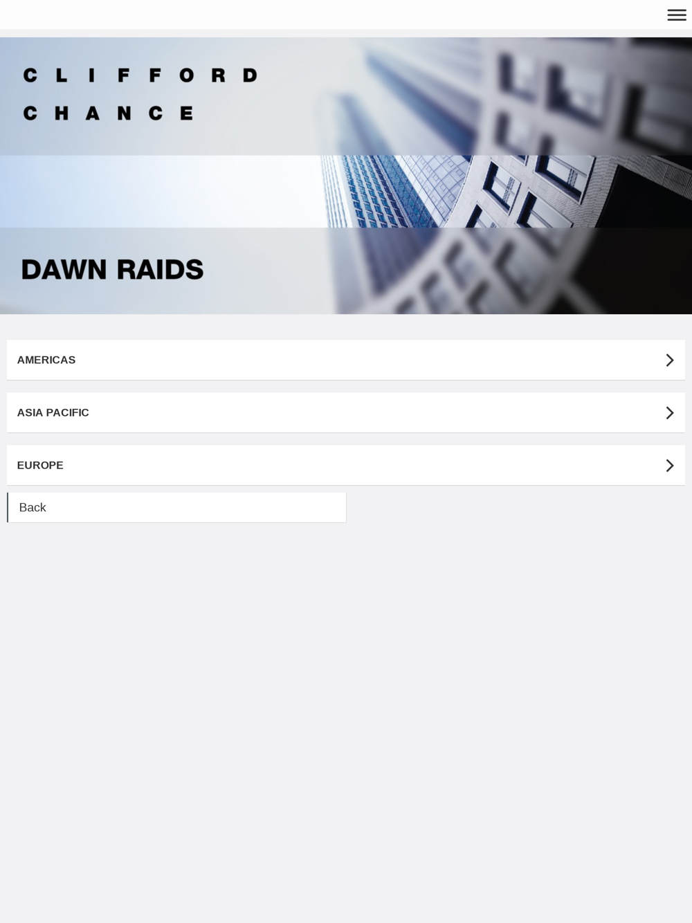Regulatory investigations are becoming increasingly common. When faced with an unexpected visit by a regulator, our priority is to help you respond quickly and appropriately. The Clifford Chance Dawn Raids App, covering multiple regulatory authorities across Asia Pacific, Europe and the United States, gives you what you need to effectively deal with urgent situations.