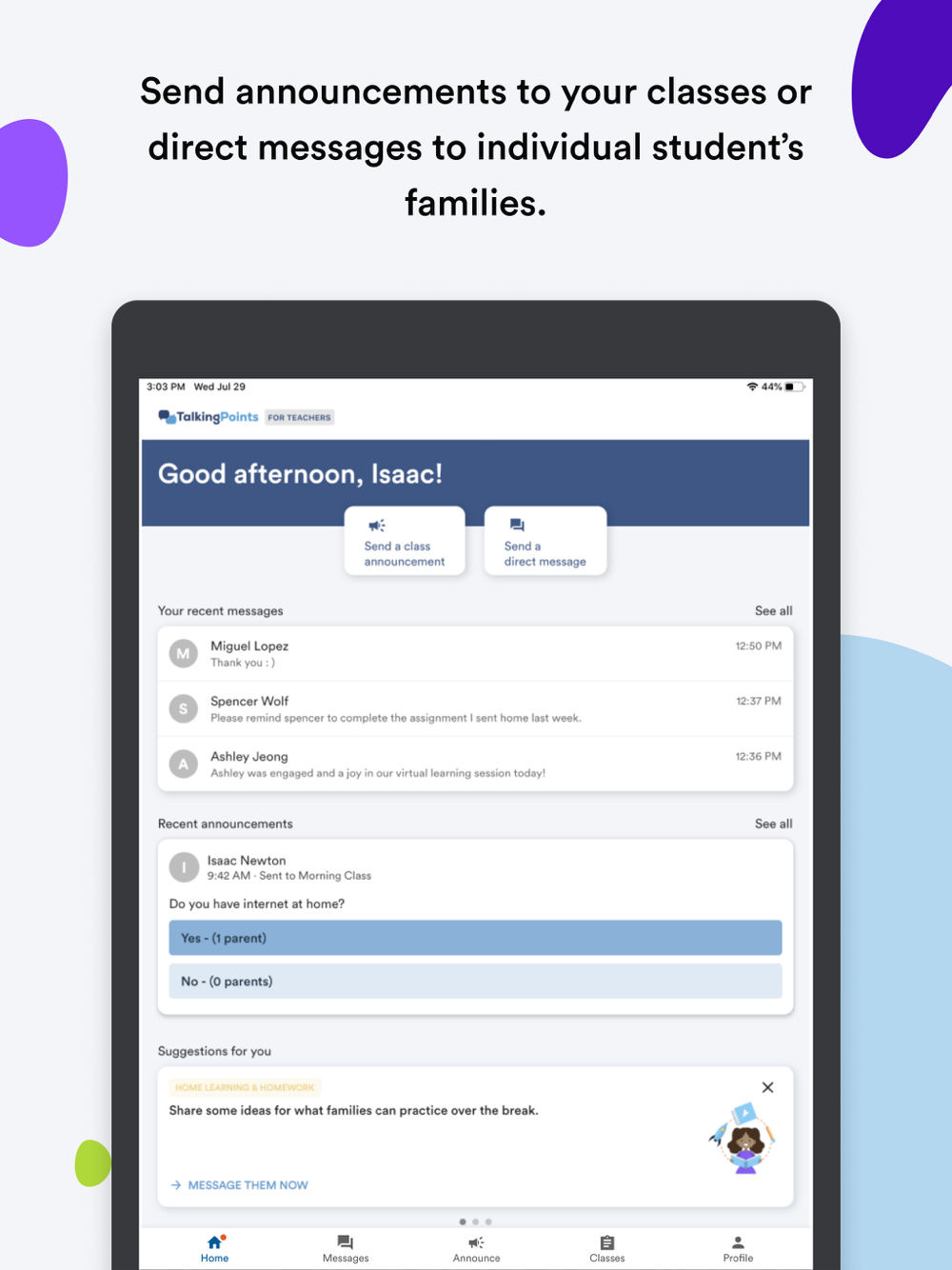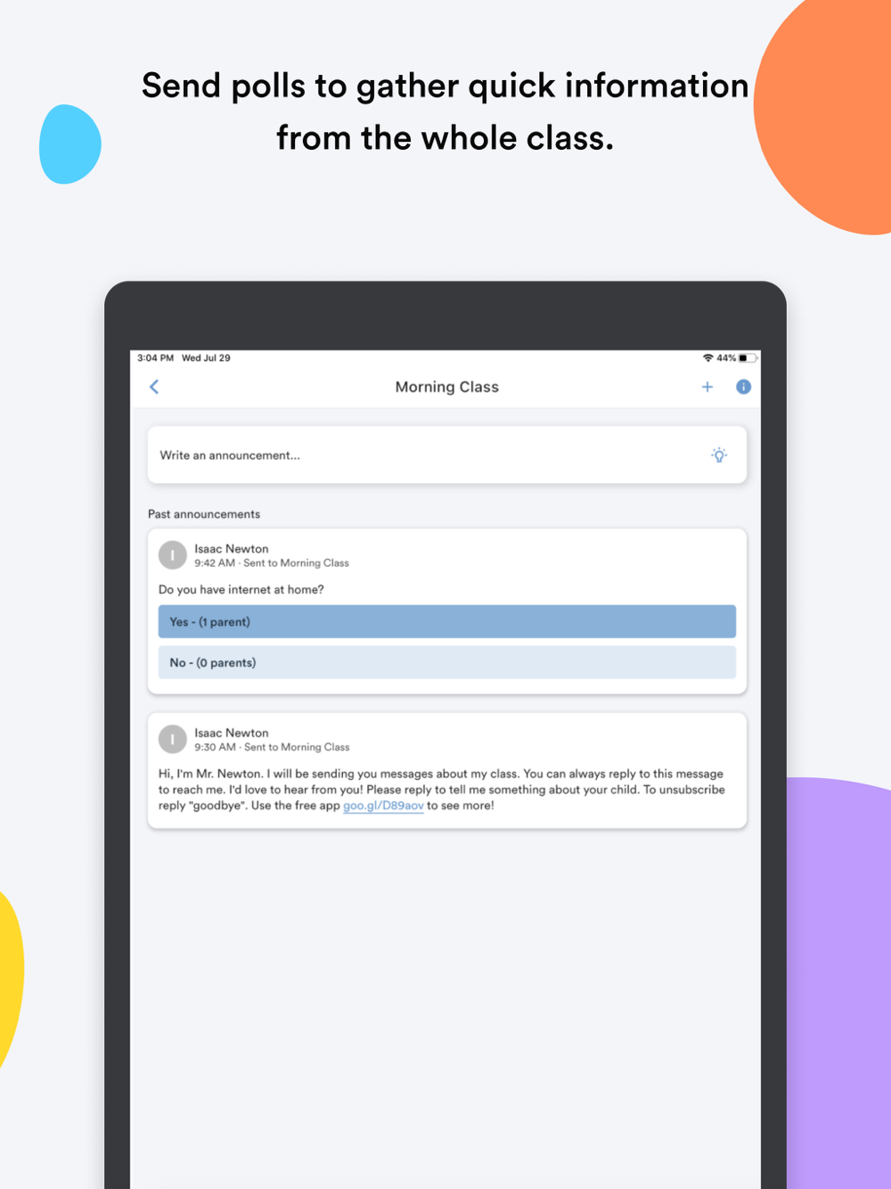 • Quickly send messages to one parent, a group of parents or to the whole class