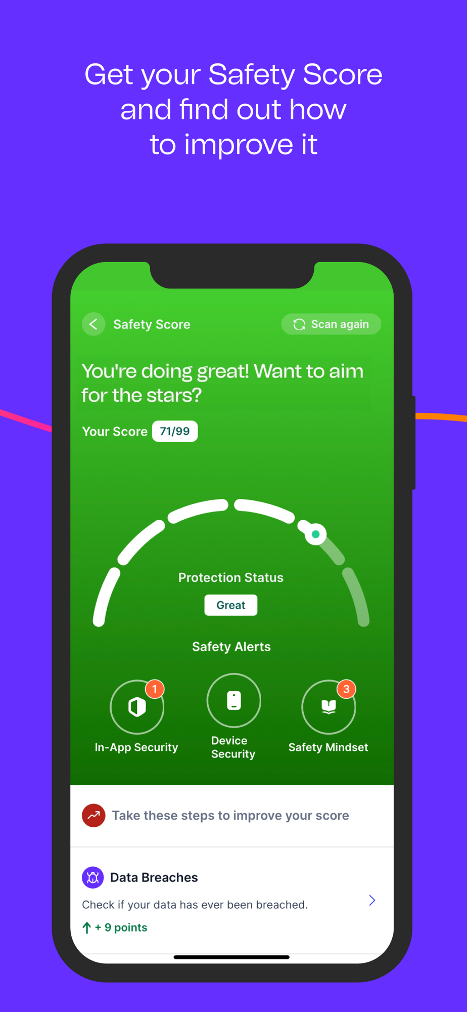 • Safety Score: Find out, at a glance, how exposed you are to digital threats, and get simple tips for improving your online protection.