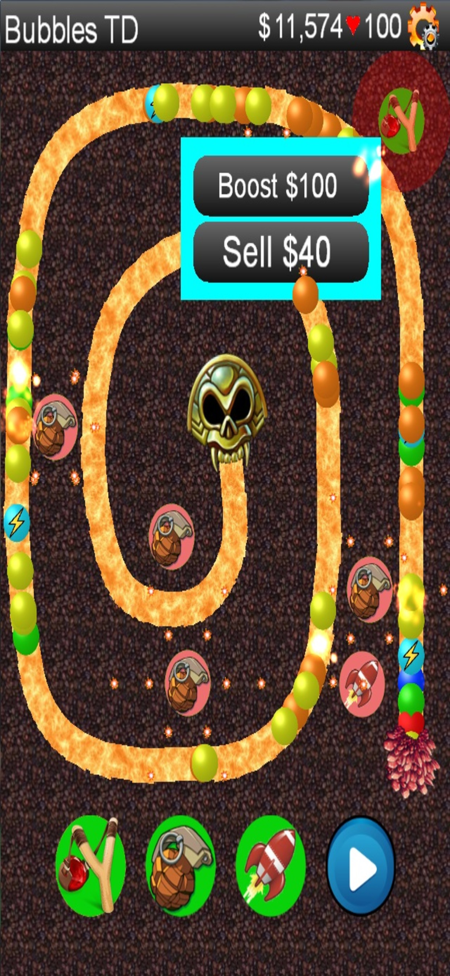 The objective of the game is to install your weapons to prevent the bubbles travelling along the path from reaching the end. Use coins, earned by shooting bubbles, to buy new weapon and upgrade existing ones. Watch out against the BOSS bubble – it has multiple lives and shoots back at your weapons. Choose between different routes and different difficulty levels.