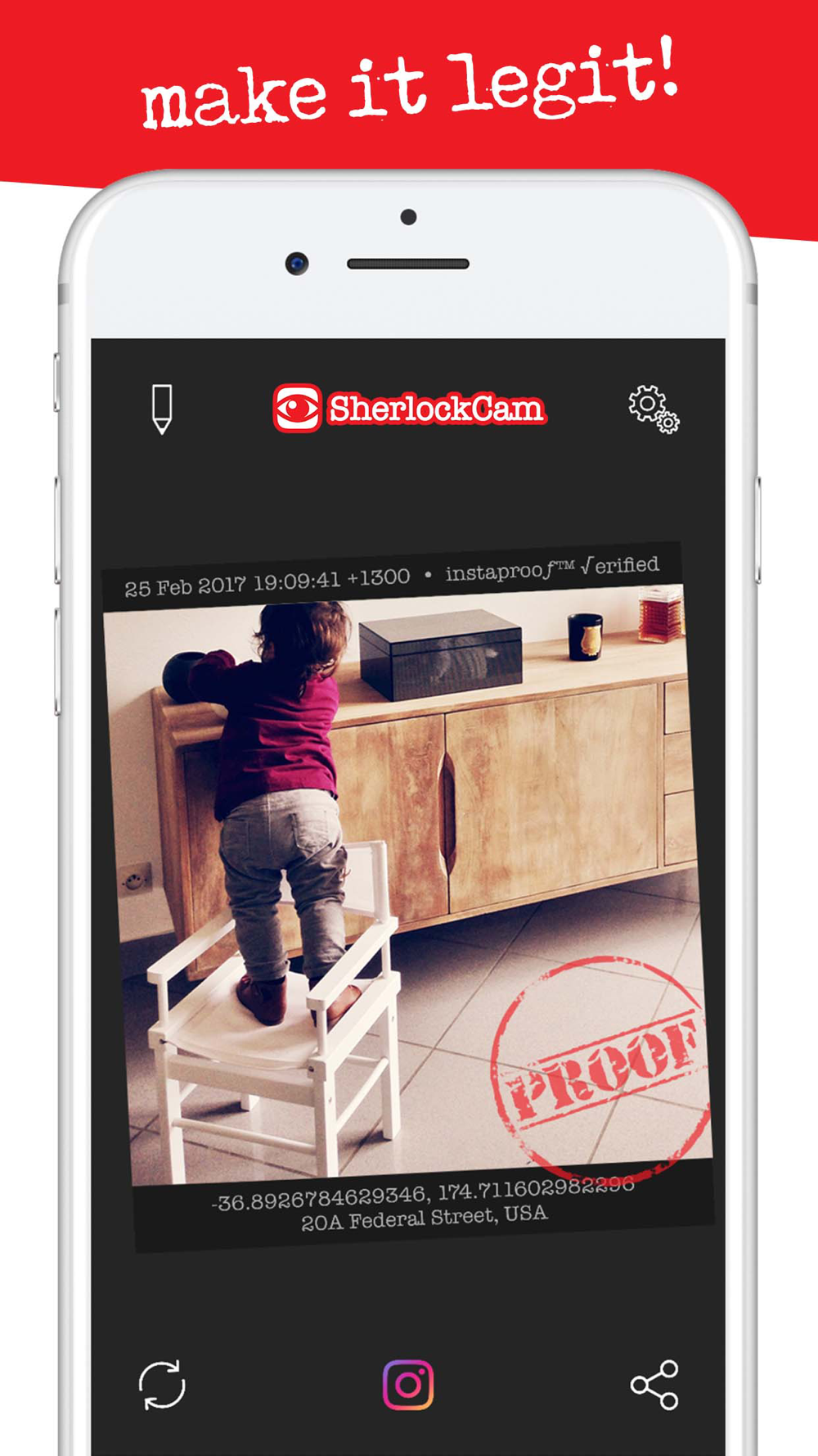 SherlockCam adds information about where and when photos are taken plus a stamp that makes them authentic proof!