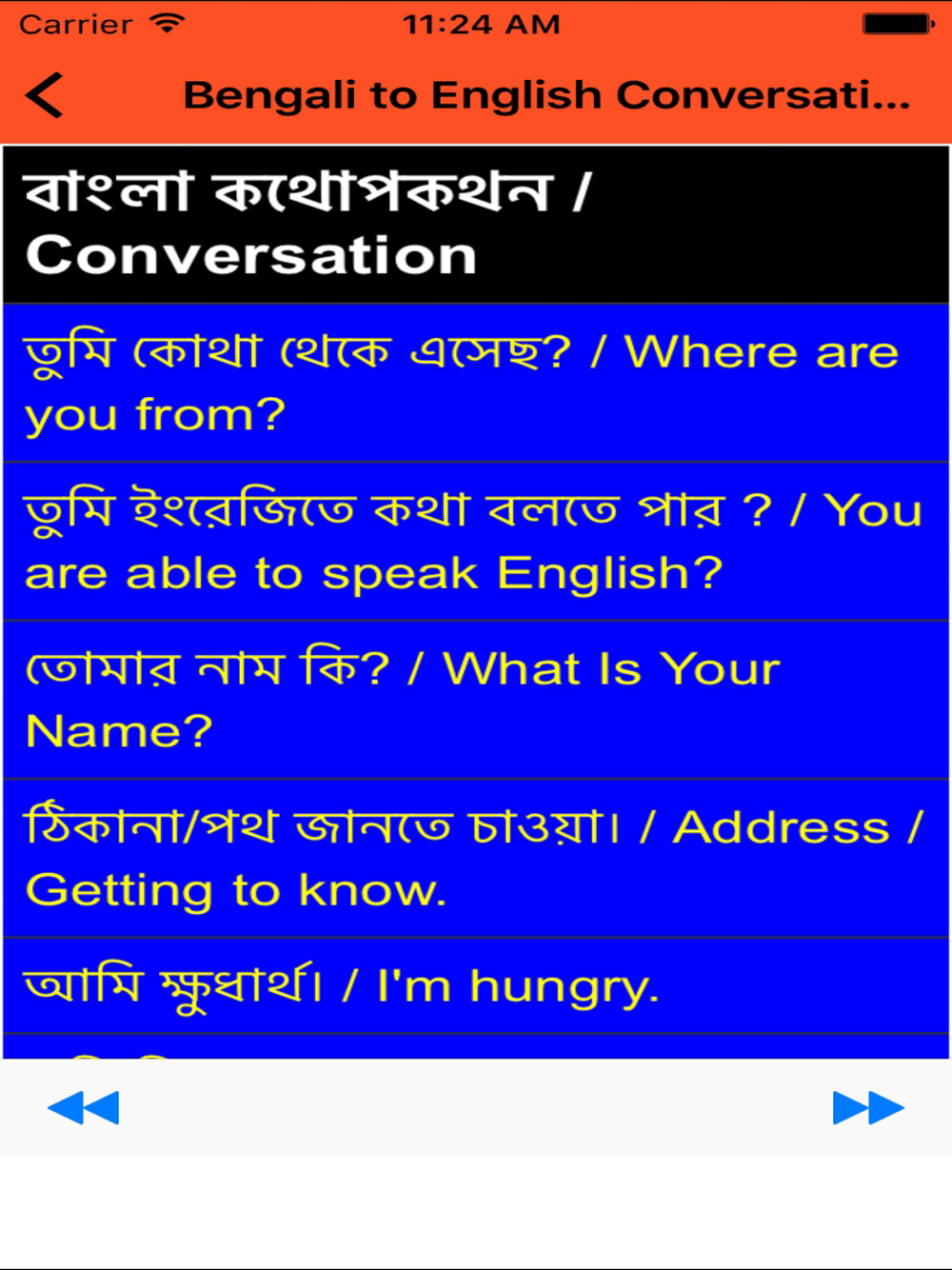 Bengali to English Conversation- Learn Bengali app is developed for English talking people. The main objective is to help people who speak English to talk in casual Bengali (Bangla) language. Two languages were incorporated here. Bengali-Japanese-English. It will be useful when someone wish to visit Bangladesh or talking with Bangla speaking people. Please remember, this application will not make you expert in Bangla but make you easy to talk in daily Bangla conversation.