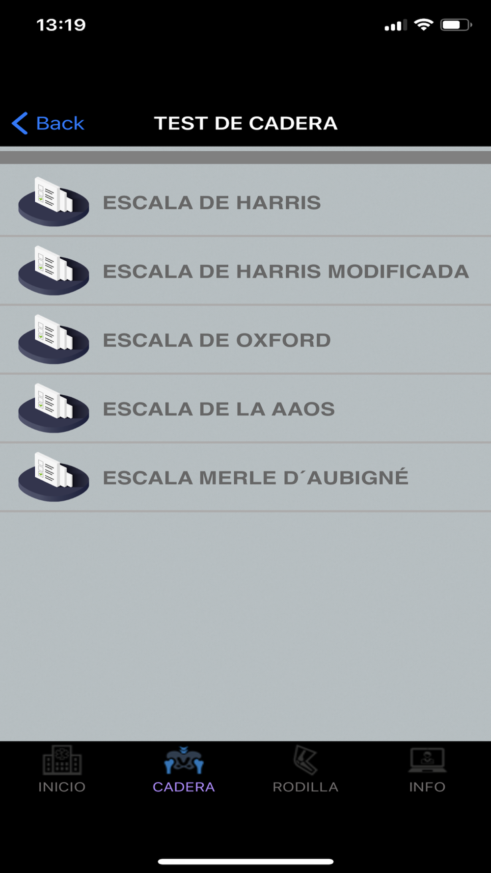 Se han incluido las principales escalas de valoración de artrosis de cadera y rodilla, que son esenciales a la hora de valorar su situación clínica tanto antes como después de la operación. Estas pueden ser fácilmente completadas por el paciente con varios clicks de pantalla y la aplicación calcula el resultado final, el cual puede ser enviado por email a su médico.