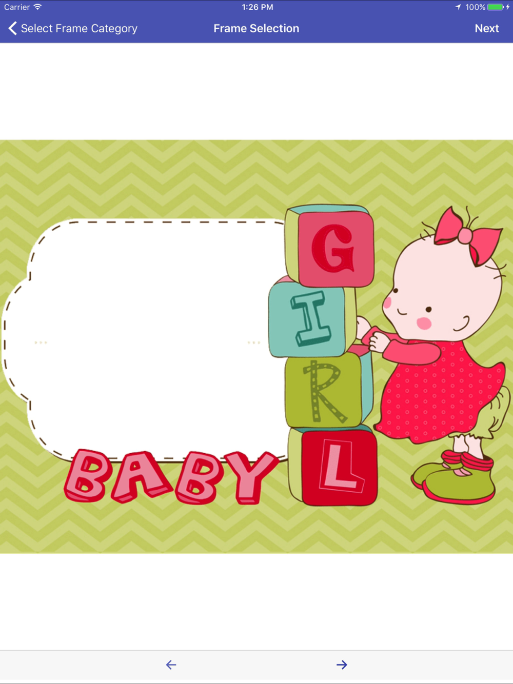 2.- Once you have picked the category, you will have to choose the frame. You can change the frame using the arrow buttons (left and right). As soon as you have found the one you like, you'll have to press the accept button at the top right of the screen.