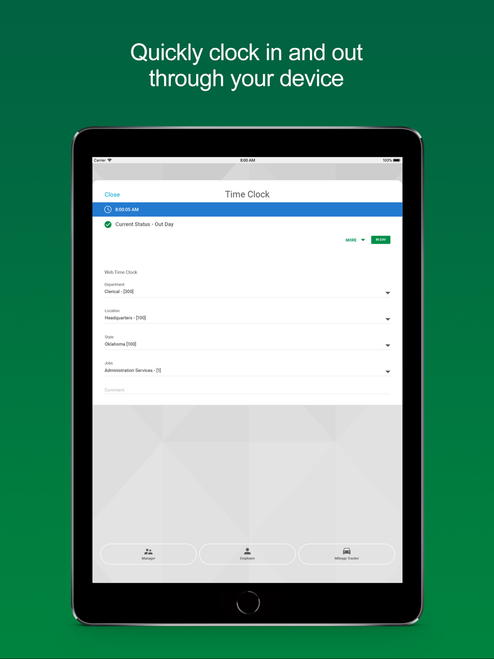Whether you punch our web-based time clock or input your hours on our web-based timesheet, you may do so through the app. You also can submit your time for approval, check your accruals and request time off for vacation, medical appointments and other events requiring supervisor approval.