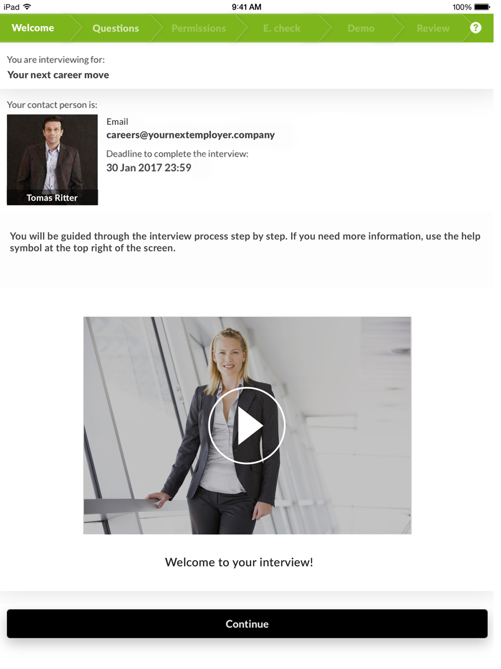 Promote yourself to prospective employers. The interview suite is a free app that lets you introduce yourself to future employers by recording a personal video interview. To use this app you need an invitation email or existing account for your video interview.
