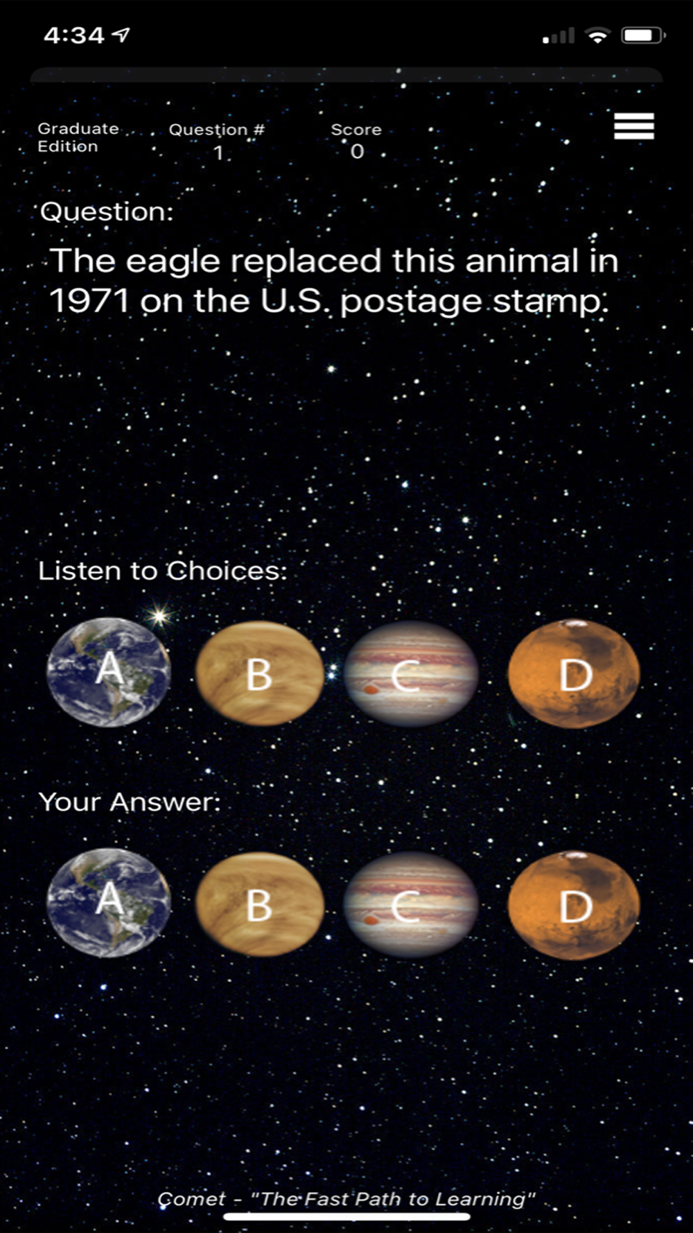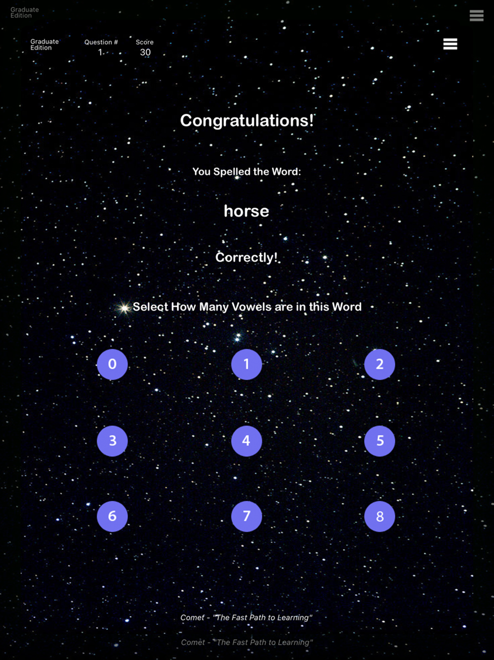 Comet The Spelling Game is the Fast Path to Learning! The Graduate Edition has over 420 questions for everyone to enjoy. Gain knowledge in an entertaining way that will amaze you. Never under estimate your spelling!