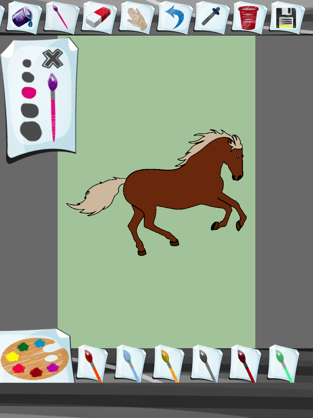 With the top Horse Coloring Book you will be able to fill the outlines of the illustration of the cutest animals and change the background into some vivid shade. Moreover, you can use the brush to draw lines over the cool photos. Adjust its size according to your needs. You will be entertained for hours and your kids as well. Fill the areas of the saddles with warm brown paints and save your work to your gallery. Alternatively, you can set it as wallpaper of your iPhone™ or iPad™. It will decorate your smartphone in a new way. If you make any mistakes do not worry just tap the undo button and it will be erased. Download free the latest Horse Coloring Book app on your tablet and play this sensational game dedicated to the lovely animals.
