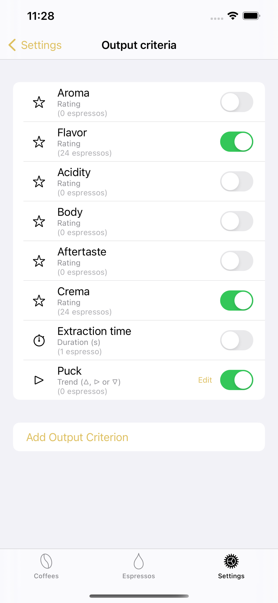• Use the predefined criteria (such as grind size, extraction time or taste) or add your own custom ones by choosing from the different types (rating, number, trend, duration, weight, free number or free text)
