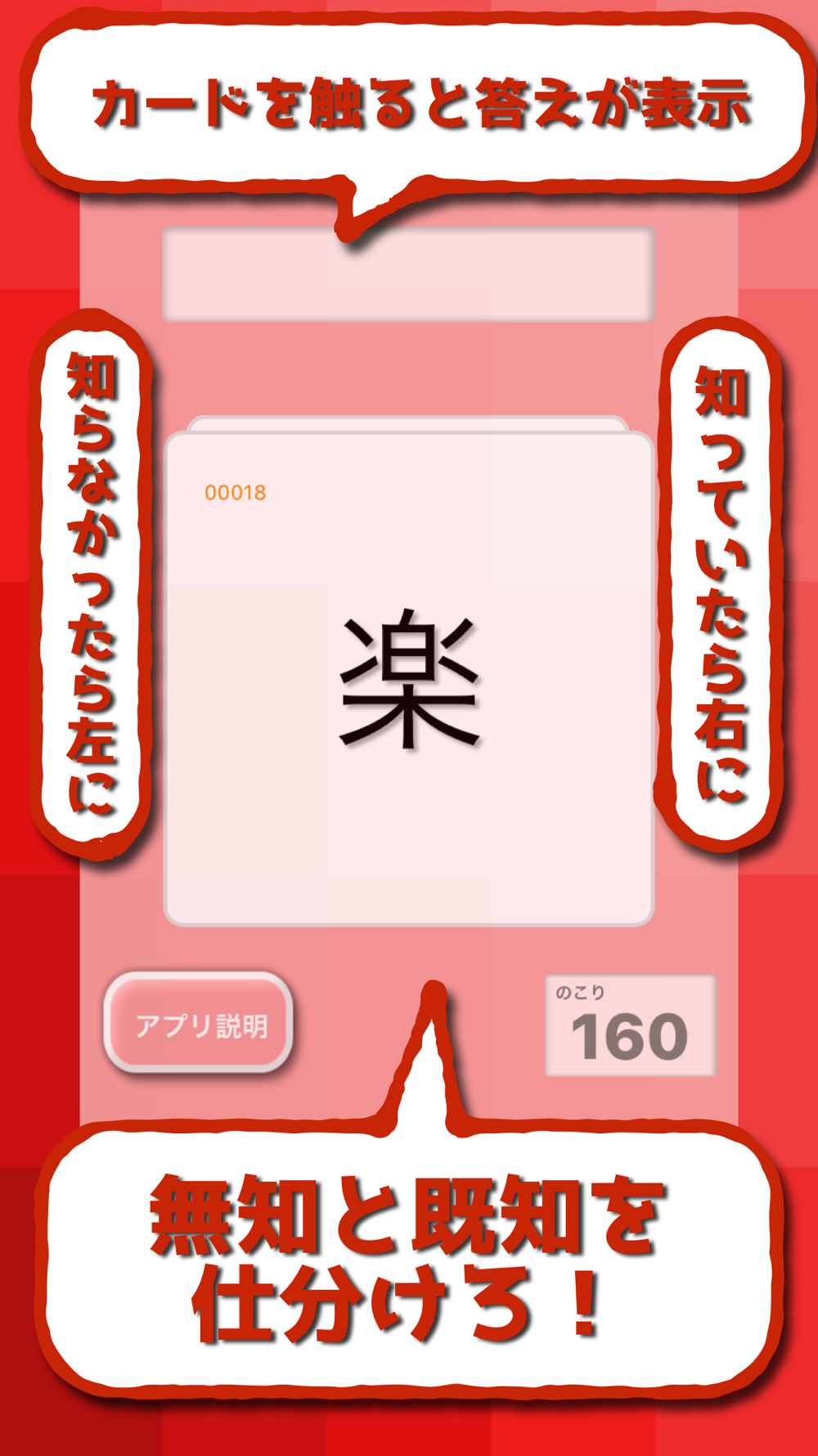 右下に覚えていないカード枚数が表示されます。右にスワイプすると一枚ずつ減っていきます。左にスワイプするとランダムでまた出てきます。