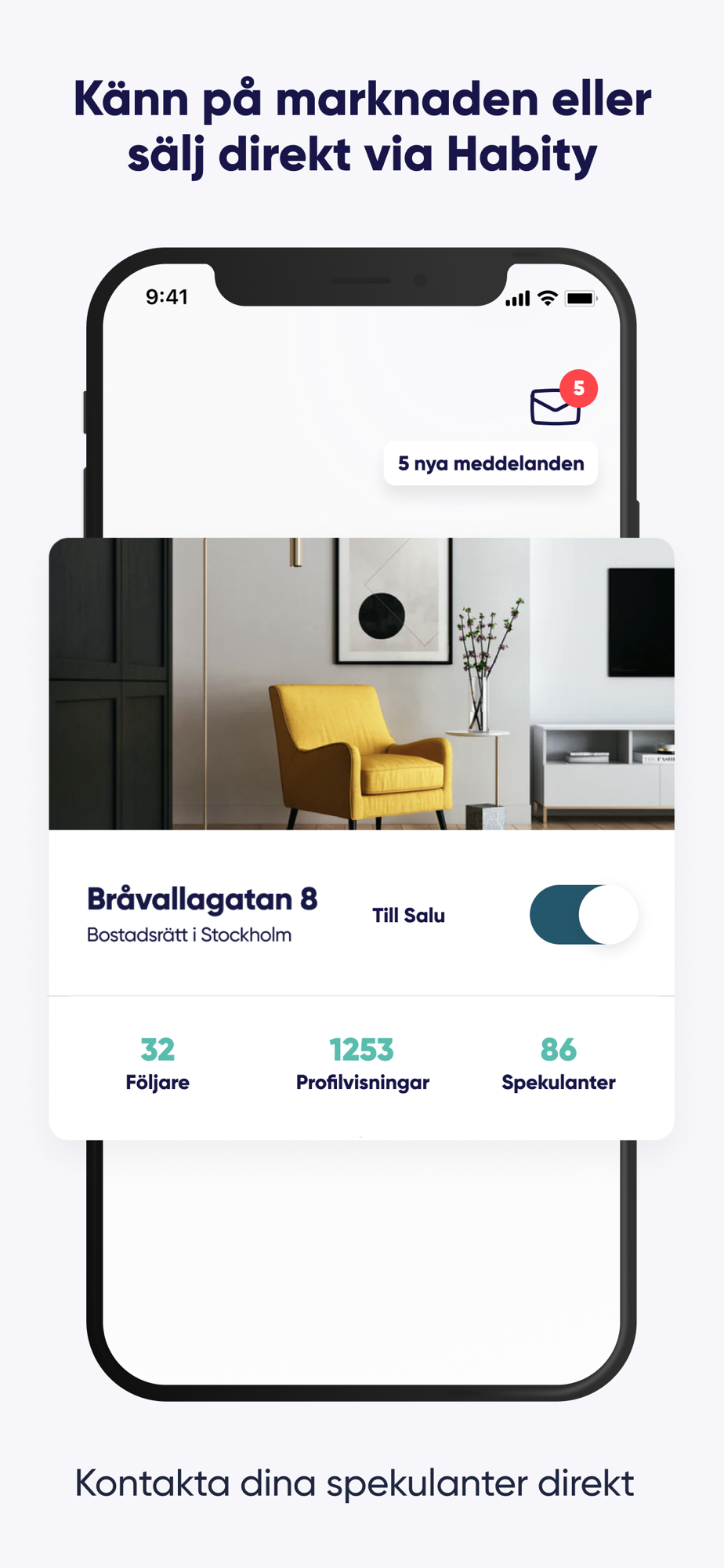 Lika självklart som att ha en yrkesprofil även om du inte söker jobb, borde det vara att ha en bostadsprofil även om du inte vill sälja just nu. Vi ser till att din bostad alltid är synlig så att du kan känna på marknaden, följa intressent för ditt hem och kommunicera med intressenter. Självklart gratis och utan förbindelser.