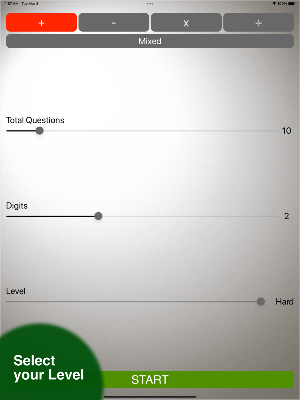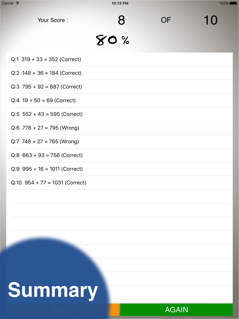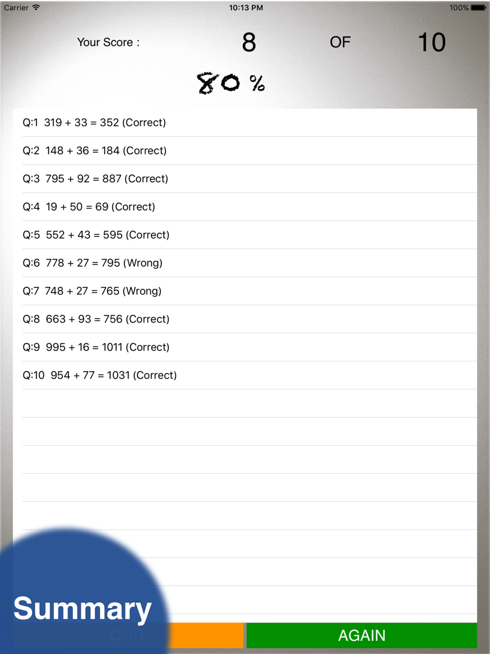 Our minimalist design allowing user to focus on the questions, no sound, no popup window, no respond after you enter the answer on each question until end of practice. Summary screen will display your score.
