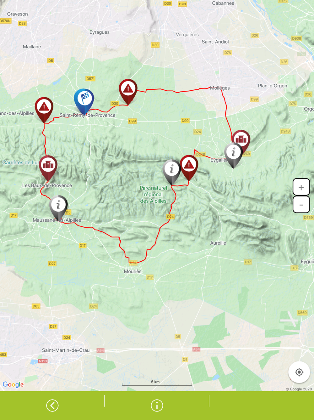 Les points d'intérêt sont classés par catégories : Info, Route, Patrimoine ou Etape, ils sont agrémentés d'une description, d'une photo et le cas échéant d'informations supplémentaires sous forme de PDF, vidéo ou fichier sonore.
