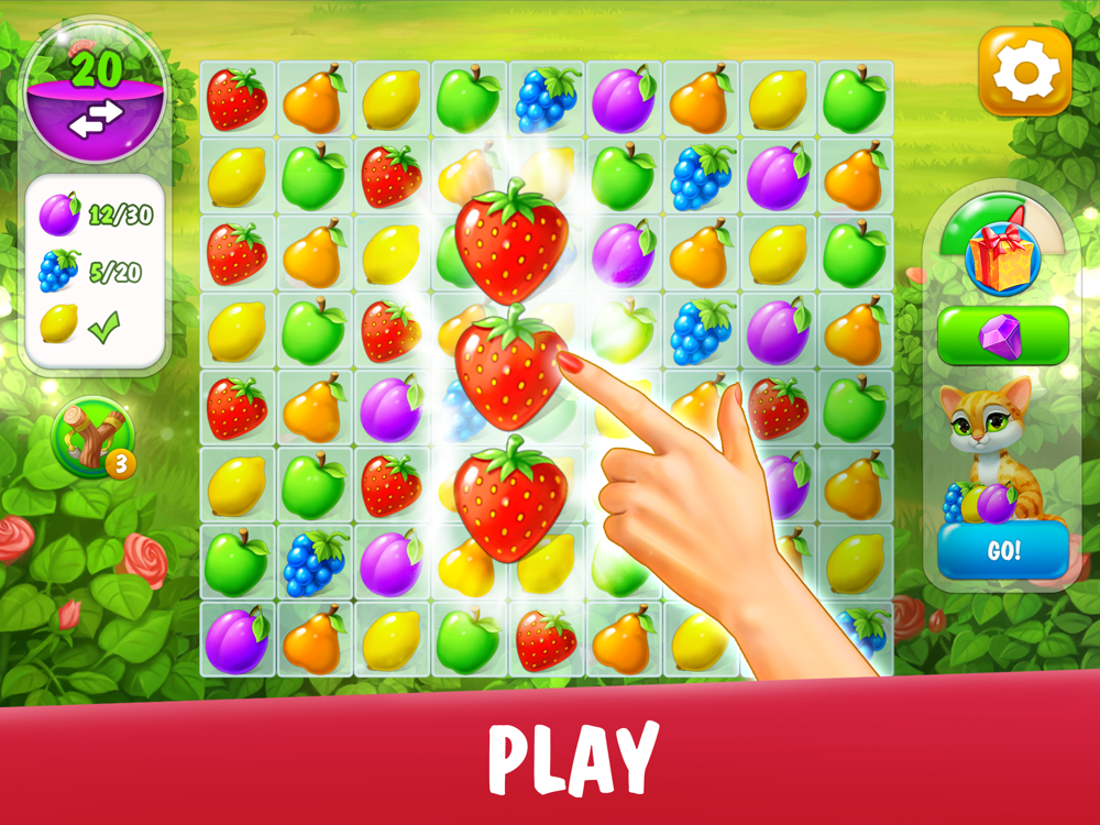 Collect delicious candy-like fruits to solve match-3 puzzle! Play with fluffy animal friends: cat, puppy and bunny!