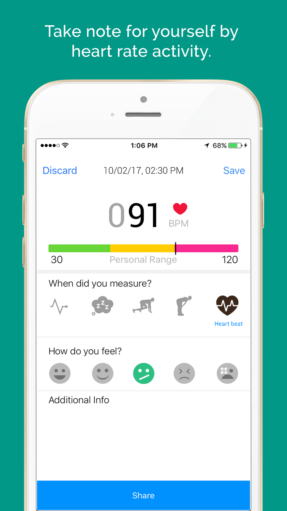- Share your heart rate measurements on social networks like Facebook & Twitter or via email
