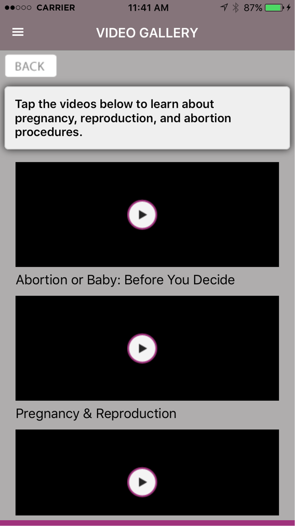 Whether you are female or male, this app will empower you by giving you the basics on fetal development and abortion procedures, delivered by medical professionals. You will also be able to answer some important questions about your relationships and your potential as a parent, partner, husband, and/or wife.