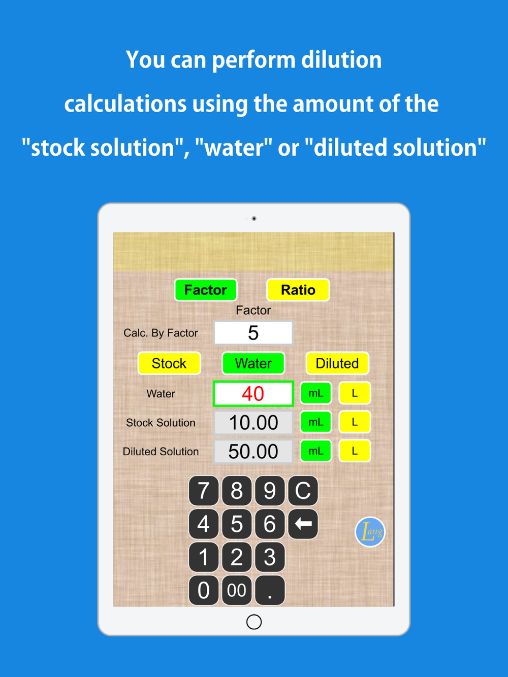 With Simple Dilution Calculator, you can now quickly calculate the amount you need using the amount of the stock solution, water, or diluted solution.