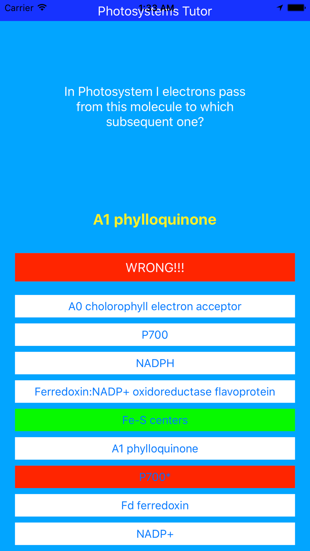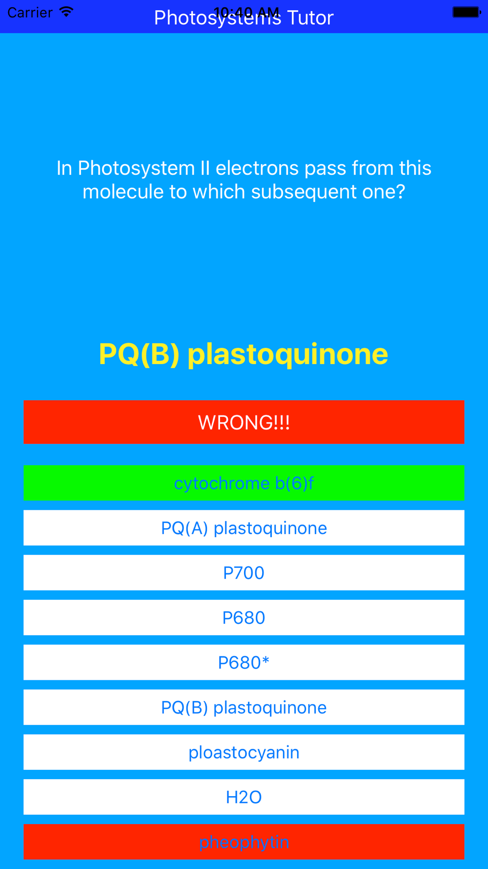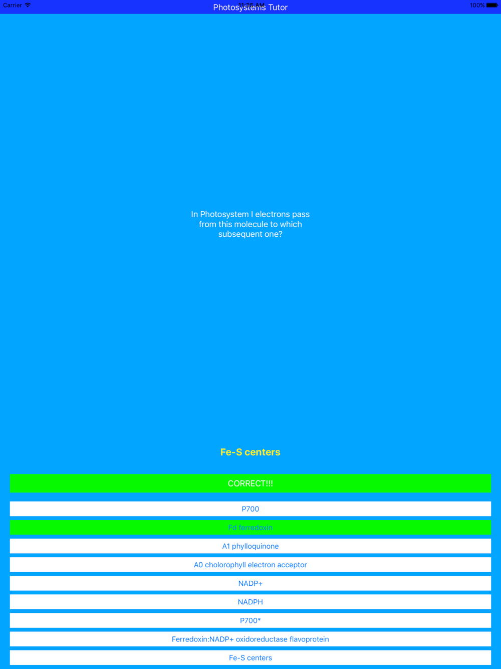 Photosystems Tutor is an app designed to help you to memorize the chemical equations of the reactions in the Photosystems I and II of the thylakoids and chlorophylls as well as the sequence in which electrons are transferred from molecular complex to molecular complex. It includes the internal transfers within the cytochromes. It is an excelled study aid for your biochemistry courses.
