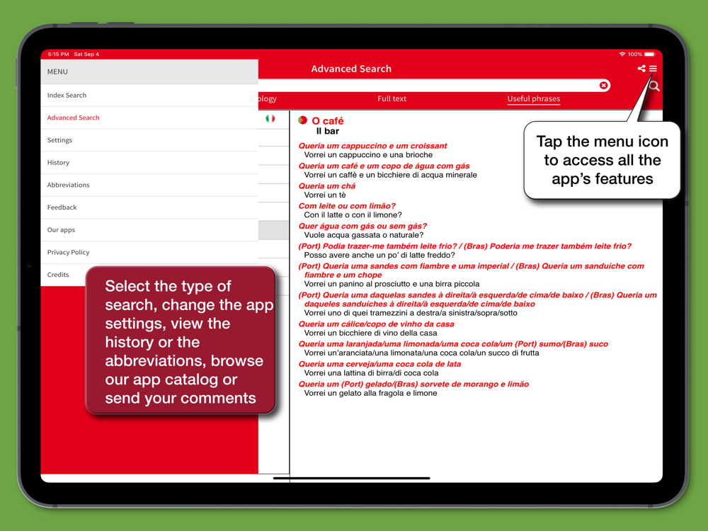 The app's interface has been redesigned to provide a simpler and more intuitive experience. Each definition can be shared using the features available in the device, such as social media, e-mail, SMS, cloud. A main menu that can be activated via an icon available at the top right of the screen enables all the features of the app:
