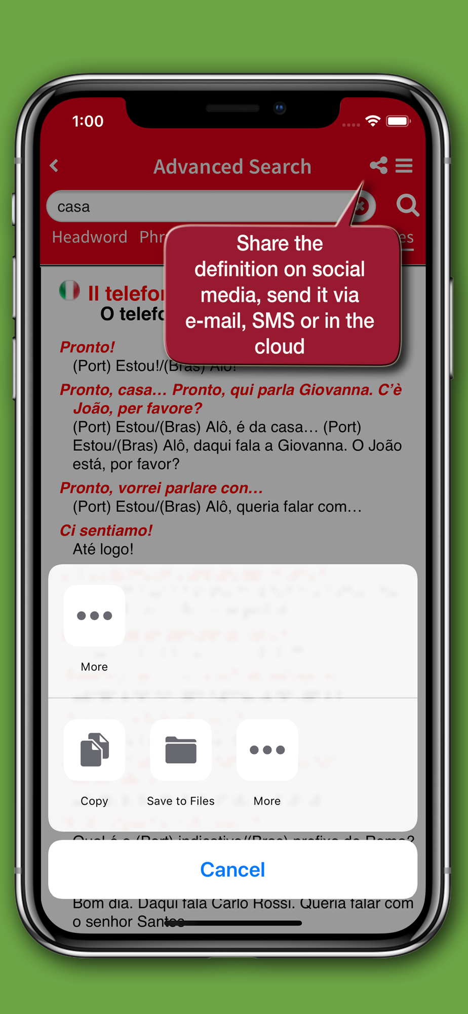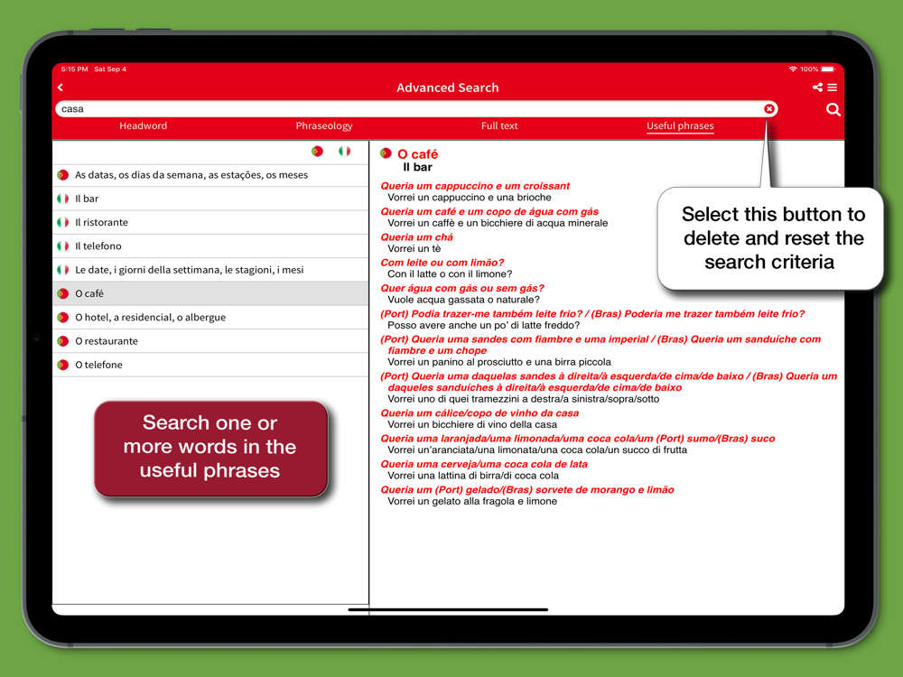 In addition to the search in the broad wordlist, the app allows you to run full-text searches and provides a useful option to search the phraseology providing for a real context of the spoken language, and making the dictionary a useful tool for quick reference as well as a safe and practical language guide for both idioms.