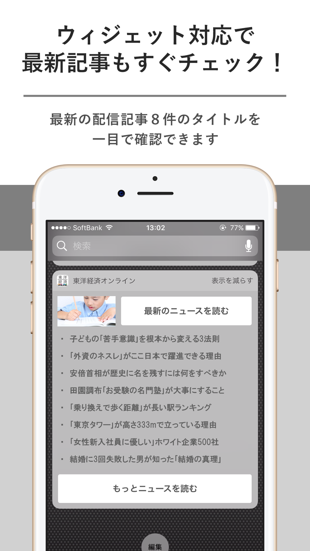 ウィジェット機能を使えば、最新ニュースの一覧をアプリの起動なしで確認できます。