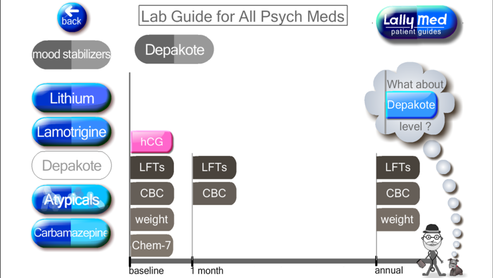 This app is free, easy, and best of all - animated. It covers routine psychiatric medications such as antidepressants and insomnia medications as well as more complicated ones such as lithium and clozapine.