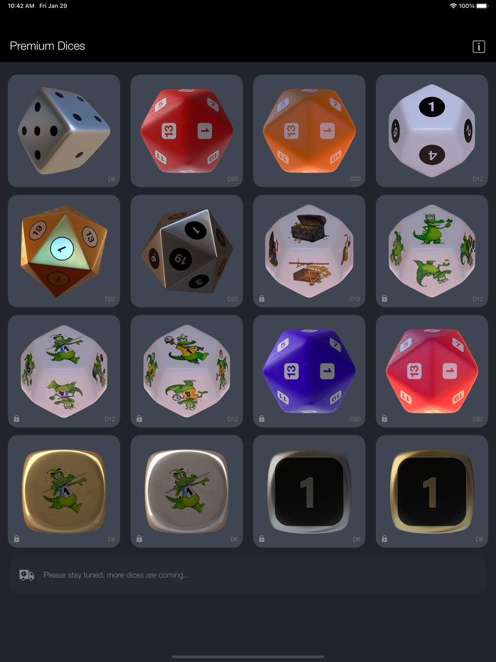 Virtual-Dice is a selection of beautiful 3D dices realized with care and passions for you. Based on a revolutionary new technology you will be able to visualize 3D scenes with rendering usually reserved to the special effects of the cinema industry. We hope you'll have as much fun using this app as we had to design it for you.