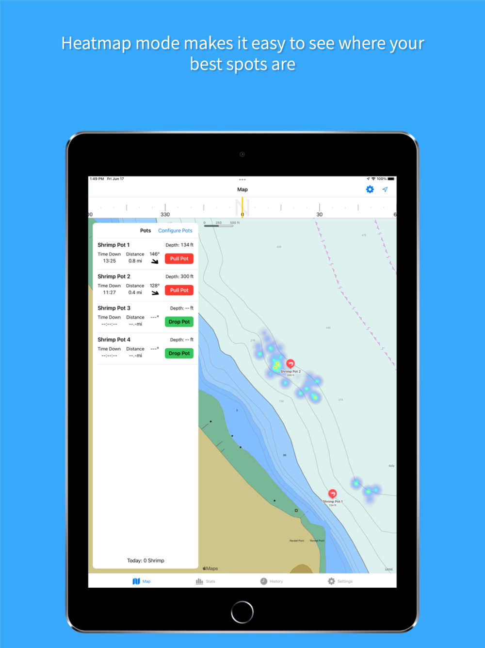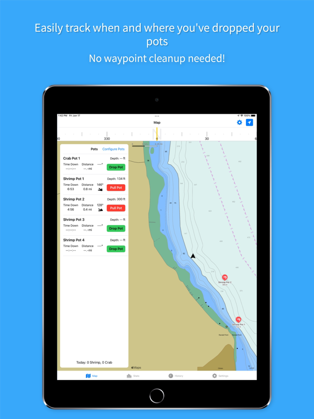 The days of needing to manually clean up waypoints on your GPS are in the past! Crab and Shrimp Pot Tracker allows you to easily keep track of where your pots are, how long they've been down, and how many shrimp and crab you've caught.