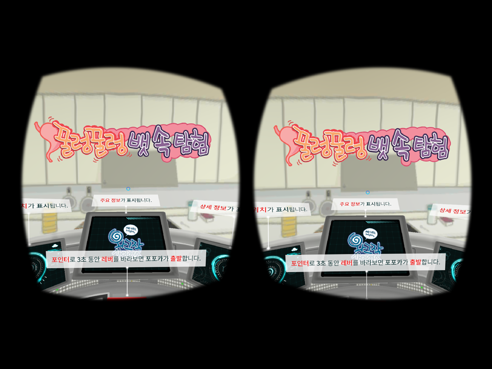 '꿀렁꿀렁 뱃속 탐험'은 초등 5학년 과학의 '우리 몸의 구조와 기능' 중, 소화기관의 기능을 학습할 수 있는 VR콘텐츠입니다.