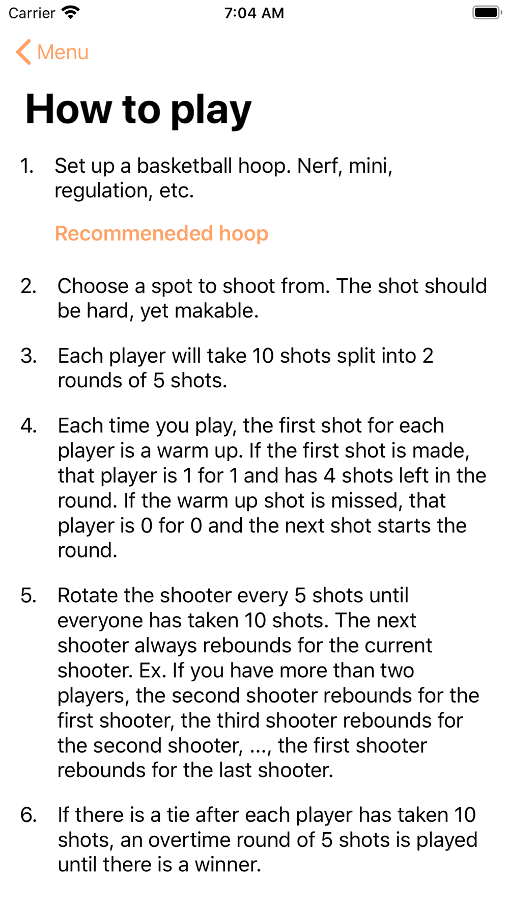 The game, Tens, is played by taking turns shooting 5 shots at a time while the other players rebound.
