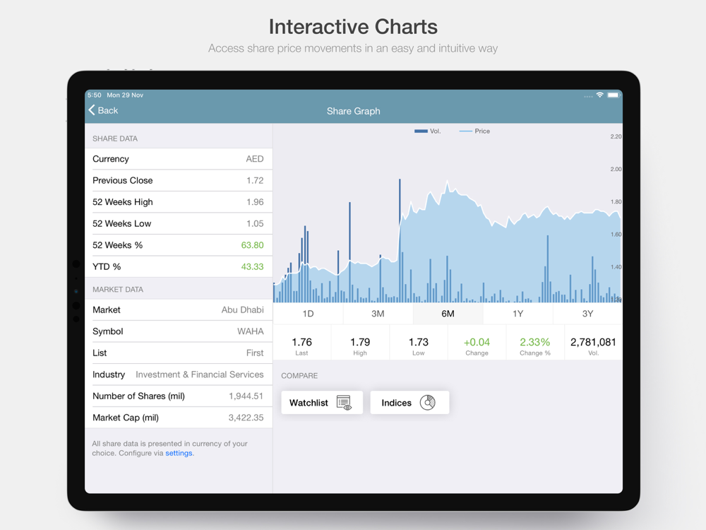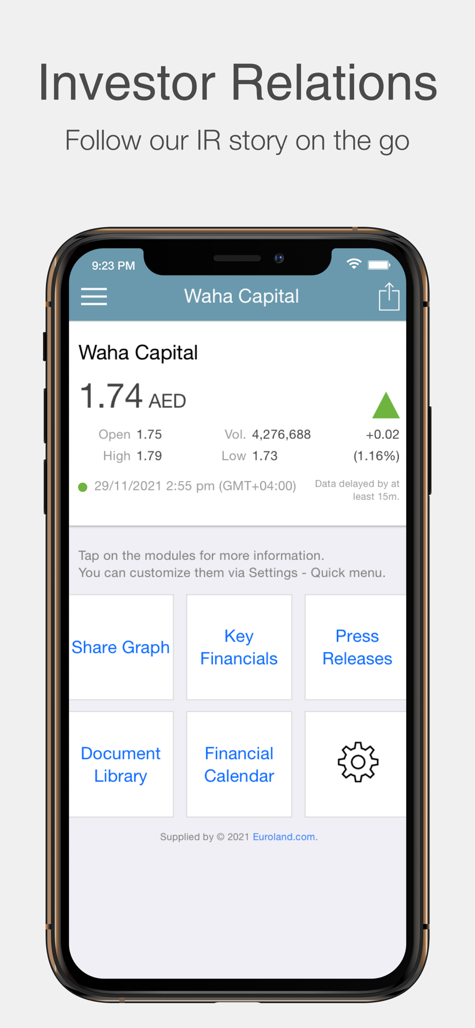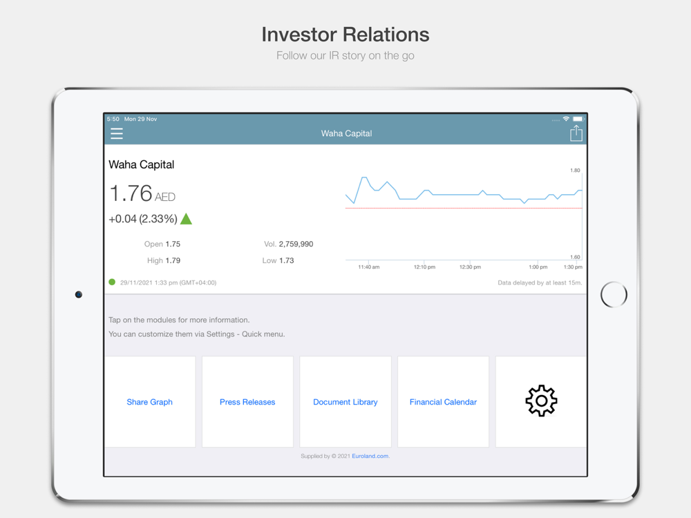 The Waha Capital Investor Relations app will keep you up-to-date with the latest share price data, stock exchange and press releases, IR calendar events and much more.