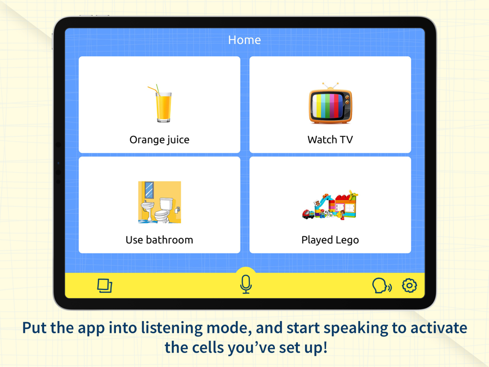 VocaTempo is a great way to tell people about yourself and your favourite stories. Once you’ve entered them you can quickly access them using your voice to select the message that you want to play. It’s easy to set up cells with a phrase and image and pair it with your vocalisation. Then when you’re in speaking mode, you can use your voice to activate it and read out the sentence.