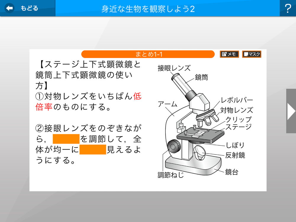 douga pocketの学習は,学習スライドと呼ばれる,学習内容をまとめたスライド形式のファイルを使って行います。学習スライドは,学習内容をまとめたテキスト部分と,その内容に対応した動画,そして理解を確かめる確認問題から構成されています。
