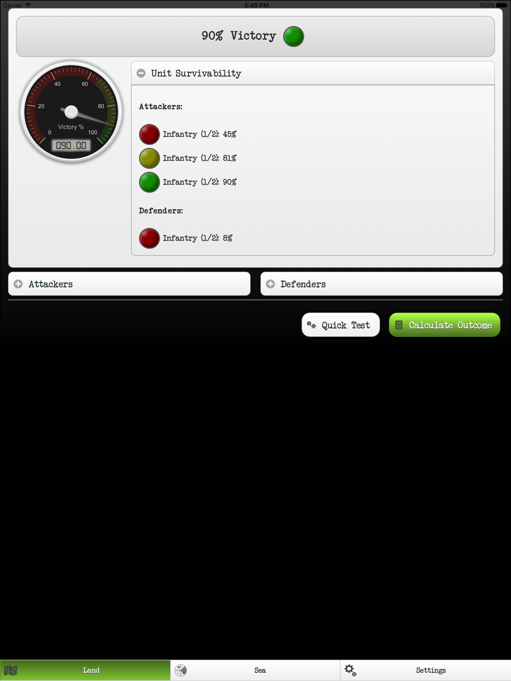 The results are generated by simulating 10,000 battles in just a few seconds and reporting the average results; thereby creating the most realistic statistical outcomes. You can also customize the order of unit destruction, to simulate the effects of destroying one unit before another. Alternatively you can also simply execute a single simulated battle, as a quick test to see what the results are.