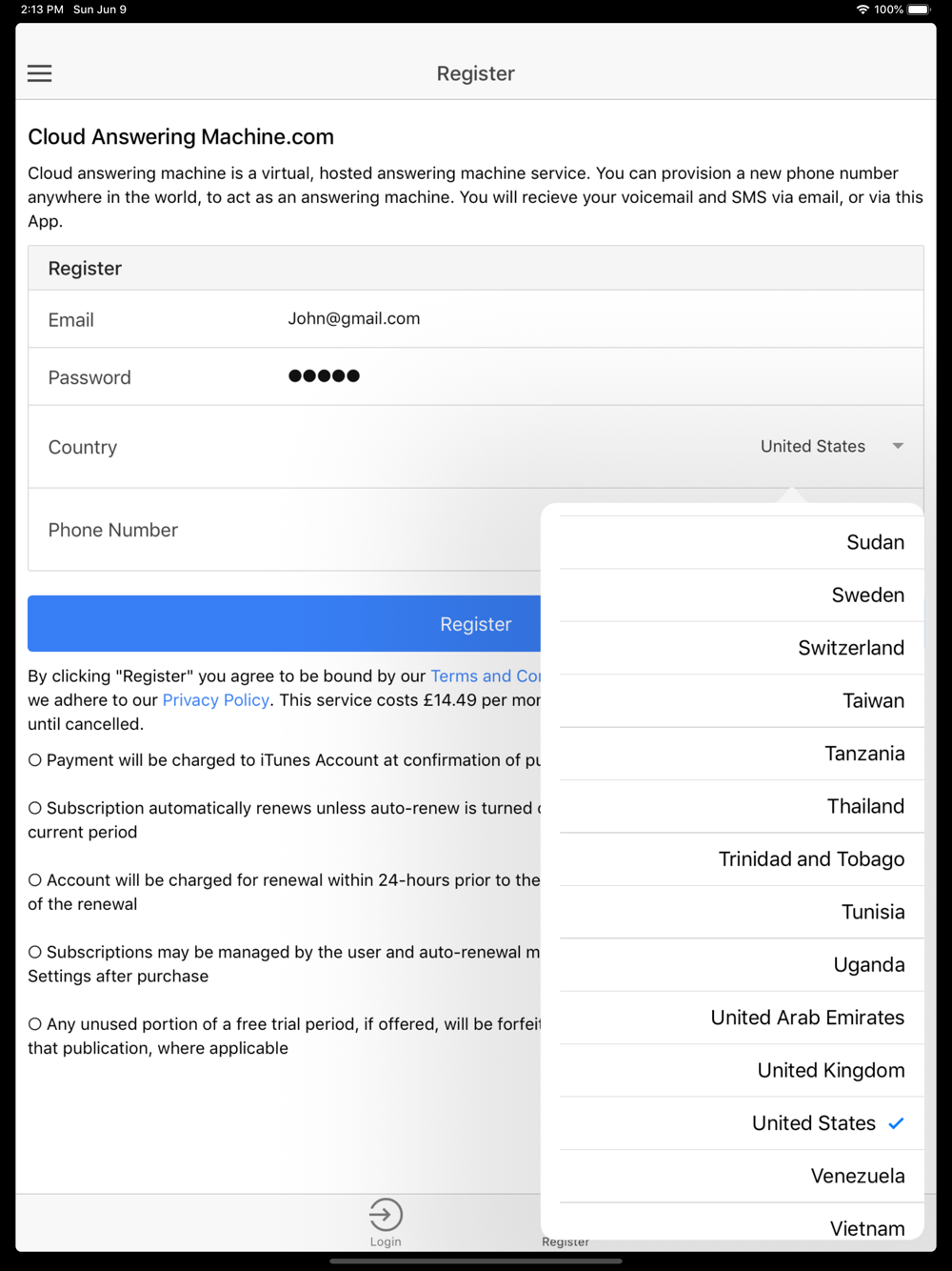 Registration requires subscription to an auto-renewable in-app-purchase, which price varies depending on your country. This subscription is billed monthly, and will run indefinitely, until cancelled. Further terms and conditions can be read here; http://www.cloudansweringmachine.com/termsandconditions.aspx