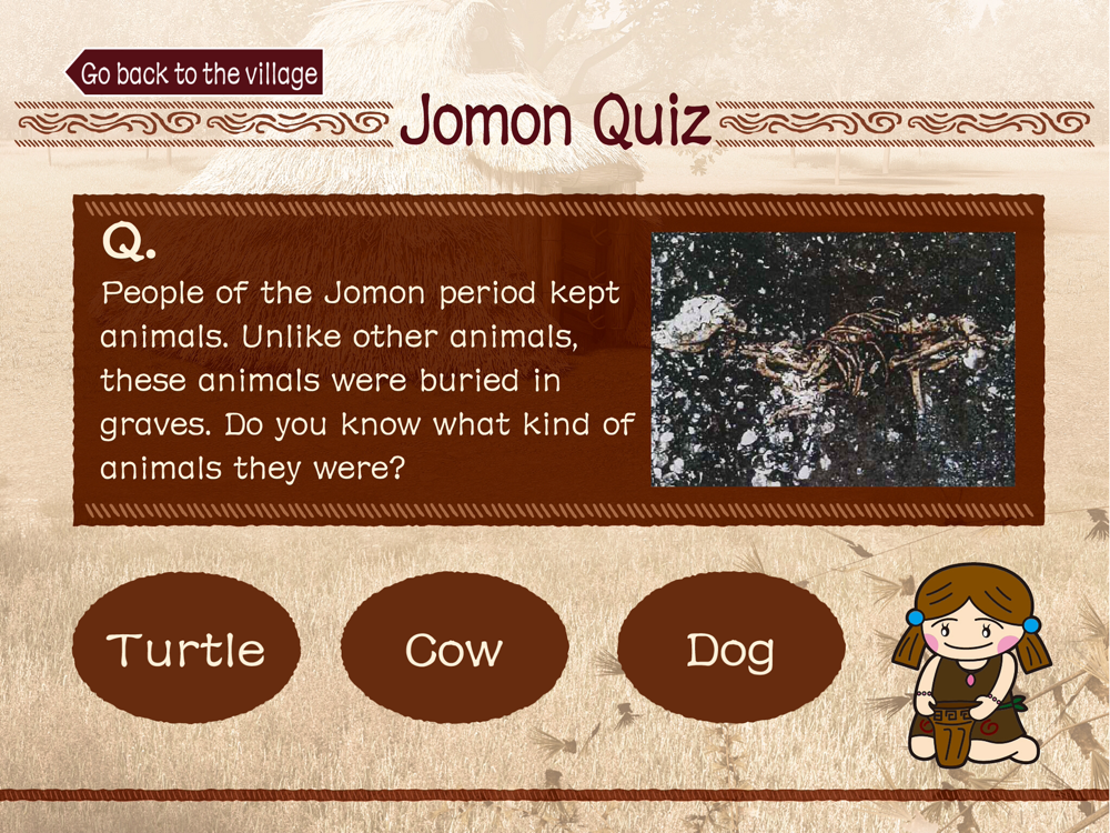 Jomon Quiz: questions related to the Jomon period are given randomly. Answer correctly, and a pottery sherd appears in a bonus screen. Collecting four of these will complete the image of the pottery.
