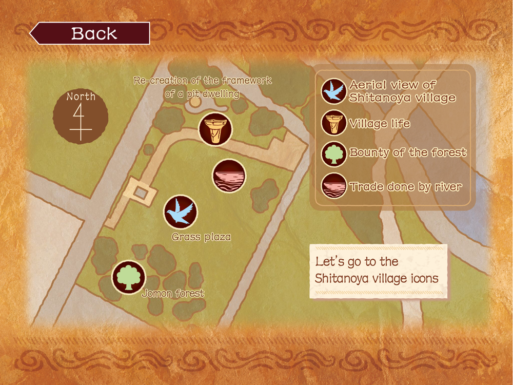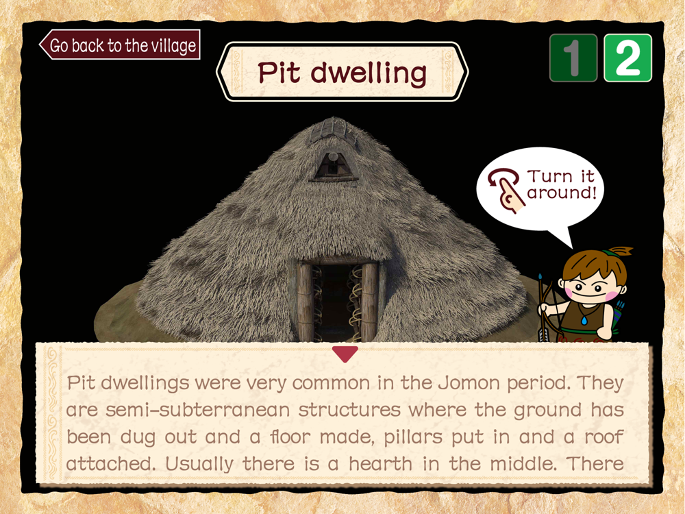 Virtual Jomon Search: Arial View of Shitanoya Village makes it possible to see the CG-created Shitanoya village of the Jomon period from the sky. In Village Life, it is possible to see a 360 degree panorama of Shitanoya village of the time. It is also possible to experience the interior of pit dwellings, the dwellings that Jomon people lived in. It is also possible to see daytime and nighttime views. In Bounty of the Forest, it is possible to see CG video of the gathering of fruits and nuts and hunting of deer, etc. In Trade Done by River, it is possible to see CG video of interchange with far away villages using boats on the still-extant Shakujii-gawa River.